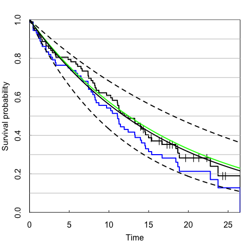 The results are plotted in Figure 1. The black step function is the adjusted Kaplan-Meier estimate, with censored observations denoted by vertical tick marks. The green curve is the true survival function for the patients randomized during the last year of accrual. The smooth black curve is the Bayesian model estimate of the survival function for these patients, and the two black dotted curves are 95% credible intervals.