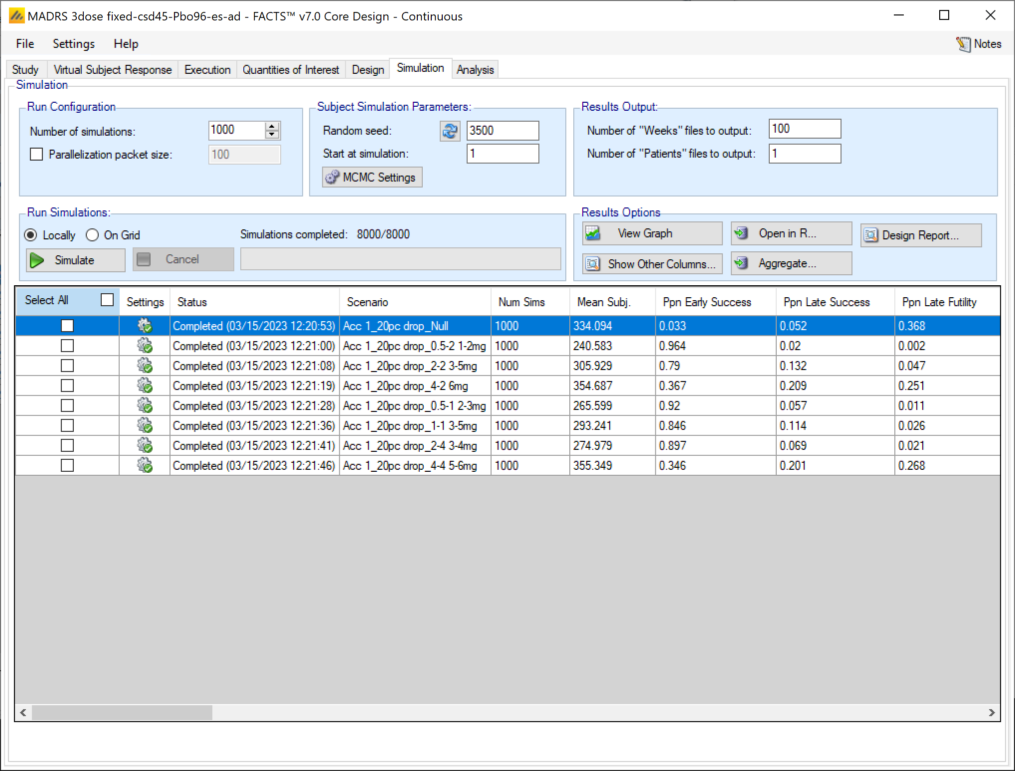 - You might want to run 10 simulations if you just want to look at a few simulated trials and assess how the decision rules work and if FACTS is simulating what you expected based on what you input on the previous tabs. If all 10 simulations of a ‘null’ scenario are successful, or all 10 simulations of what was intended to be an effective drug scenario are futile, it is likely there has been a mistake or misunderstanding in the specification of the scenarios or the final evaluation or early stopping criteria.
