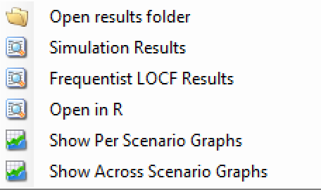 Frequentist results | If frequentist analysis is enabled, the summary results can be viewed, these are grouped by how missing data has been treated: Last Observation Carried Forward (LOCF), Baseline Observation Carried Forward (BOCF – if baseline has been simulated), Per-Protocol (PP). |
