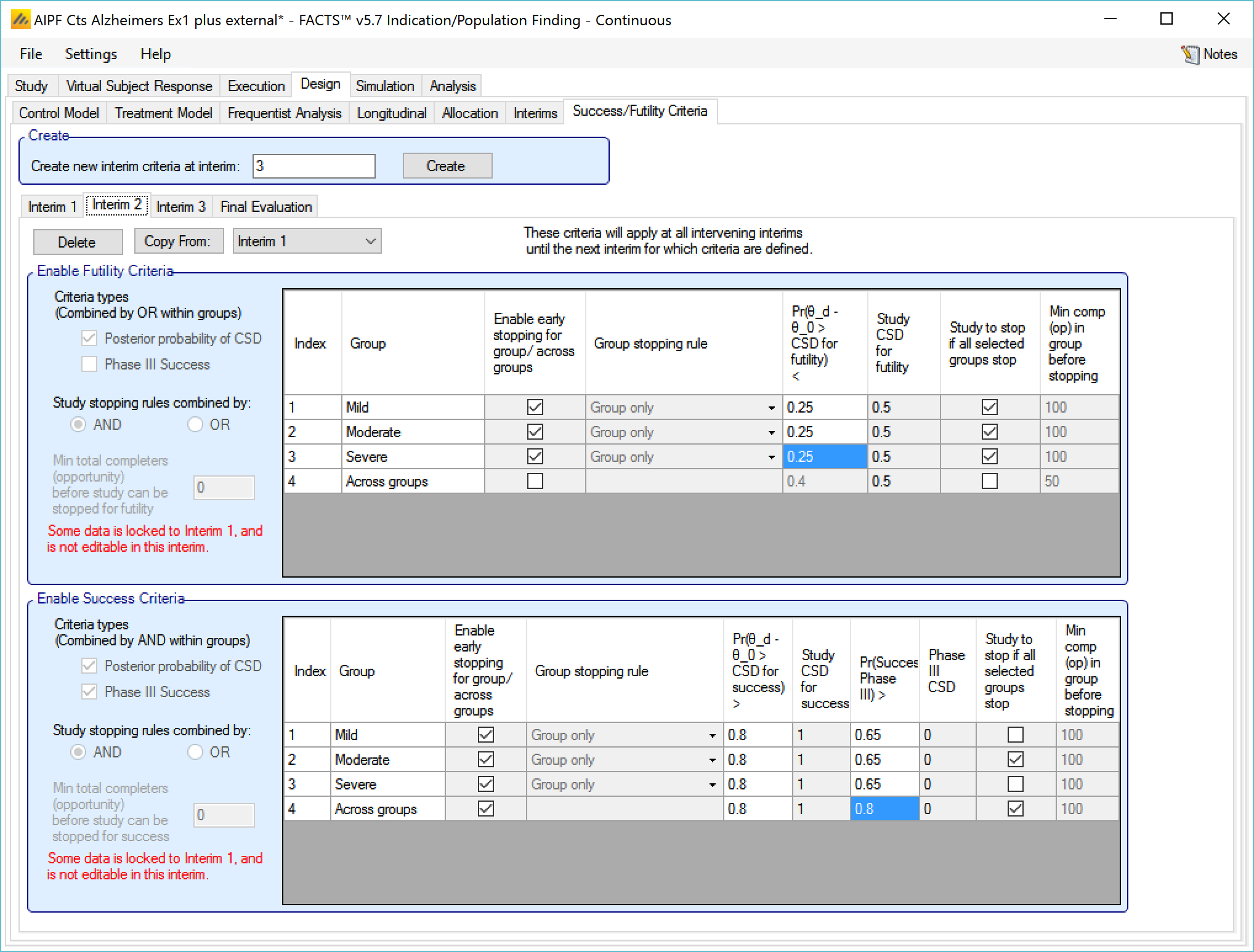 On the success/futility criteria page the user can specify rules for judging the study for futility or success at an interim and at the final evaluation. If the trial has no interims there will be just a tab for the Final Evaluation criteria. If the trial has interims then there can be tabs that define different early success/futility criteria at the different interims.