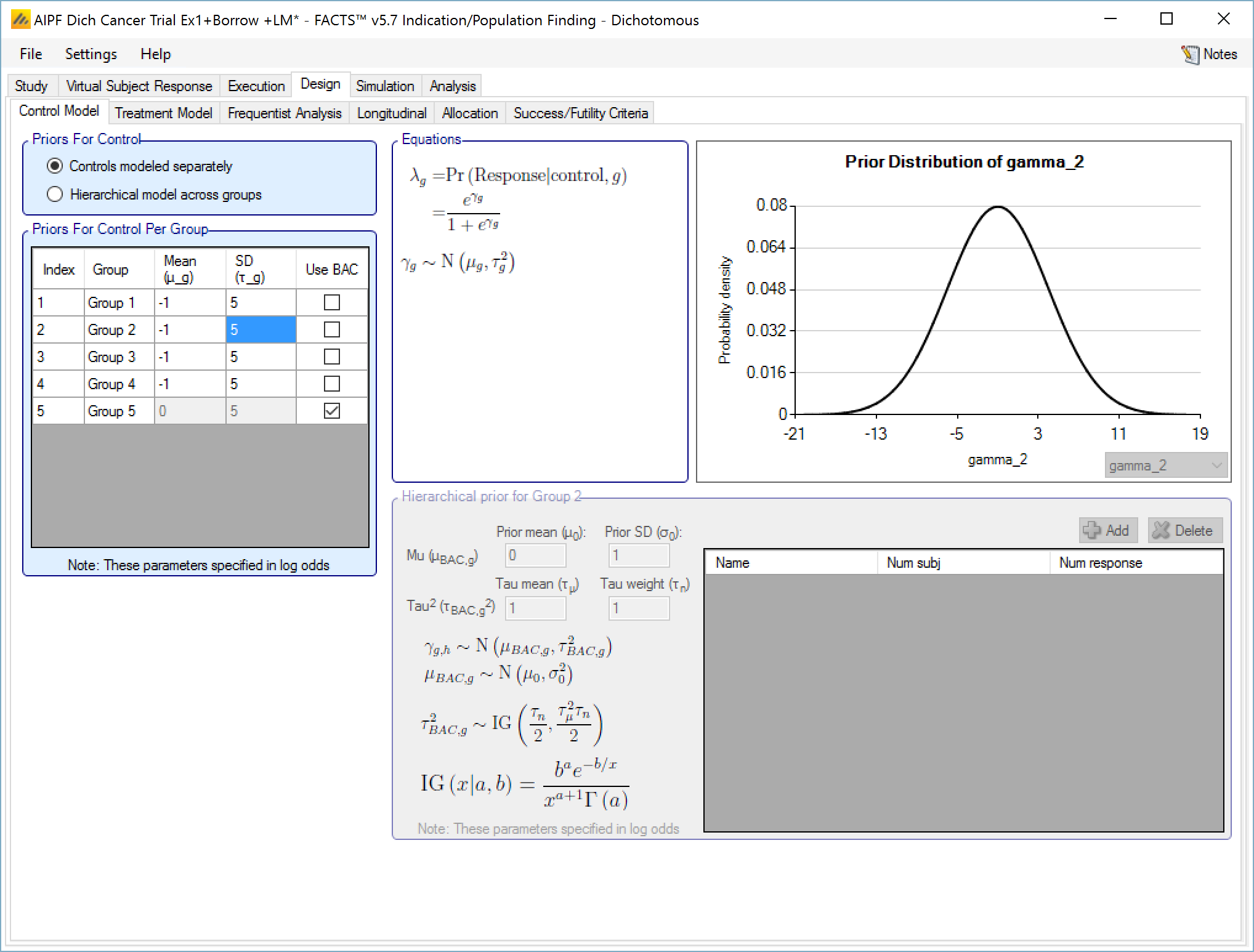 If on the Study > Study Info tab, ‘include historical control’ has been selected then the control model is simply the specified fixed mean response on control in each group.