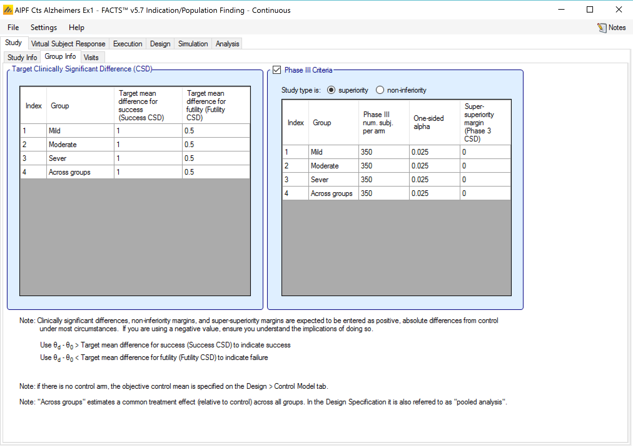 In a trial to show superiority, for each group the Target mean difference for success and Target mean difference for futility may be specified, these are referred to as the CSDs (Clinically Significant Differences). Optionally the parameters for a phase 3 may be to allow the predictive probability of subsequent success in such a phase 3 trial to be used as decision criteria.