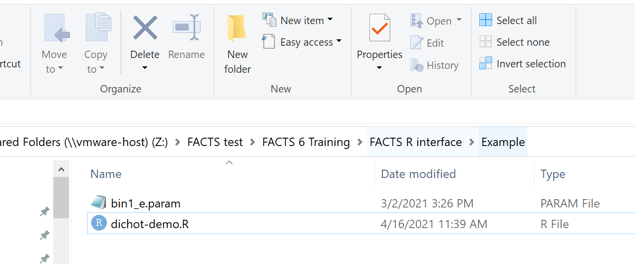 setwd(“z:/FACTS test/FACTS 6 Training/FACTS R interface/Example”)The factR.R file is located in the parent folder: