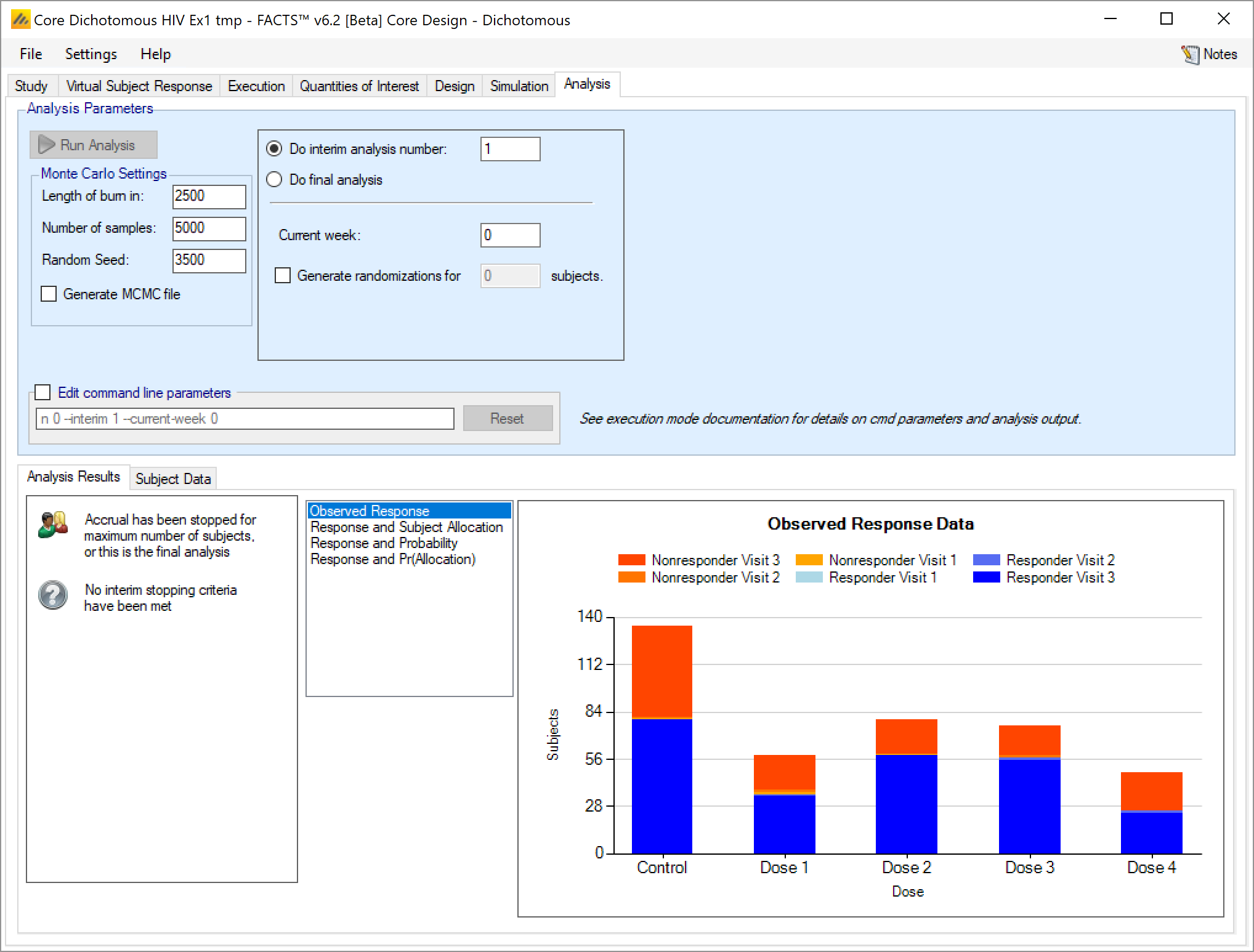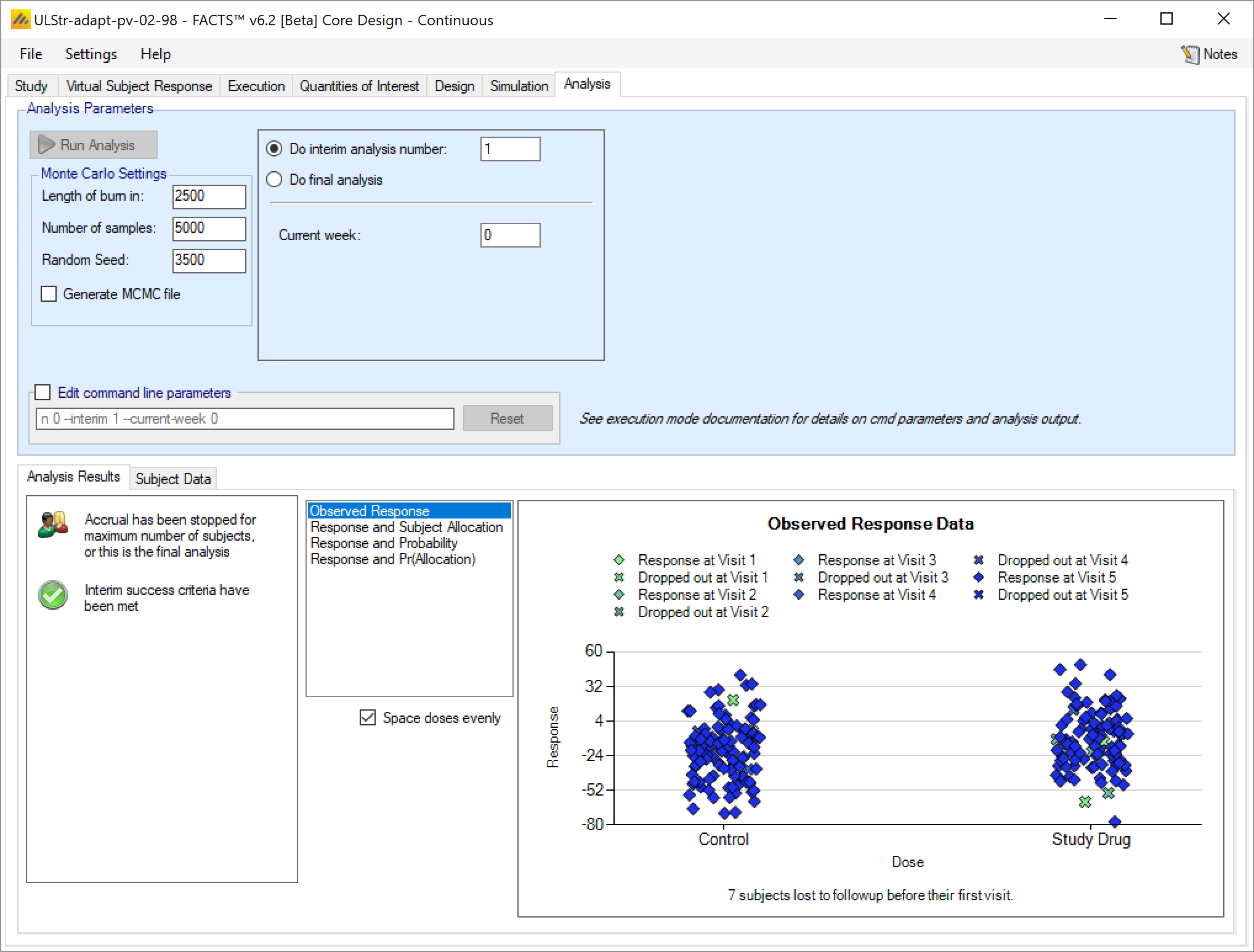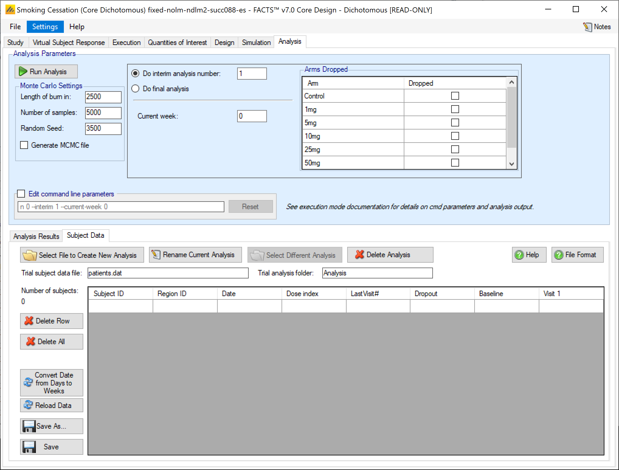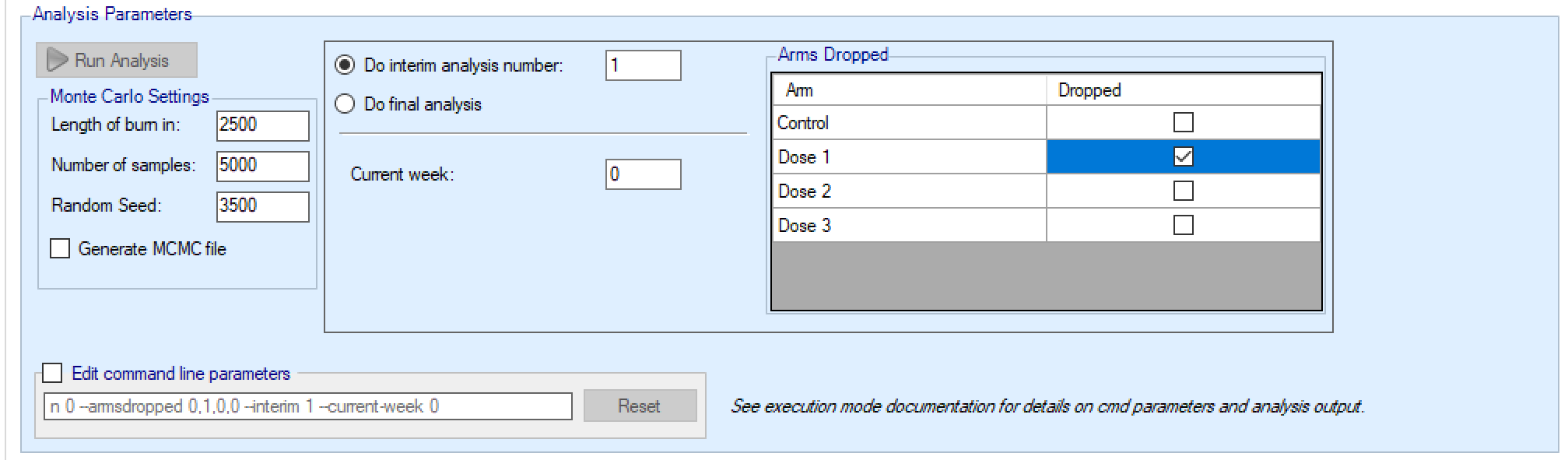 If this is an arm dropping design, it is possible to flag which, if any, doses have already been dropped and hence to be excluded from future adaptation decisions, but included in the analysis [this can be used even if the design is not an arm dropping design – to allow for an arm being dropped for reasons outside the scope of the simulation, such as logistical or safety reasons but only be entering the ‘-armsdropped’ command line parameter the control is only displayed if the design includes arm dropping].