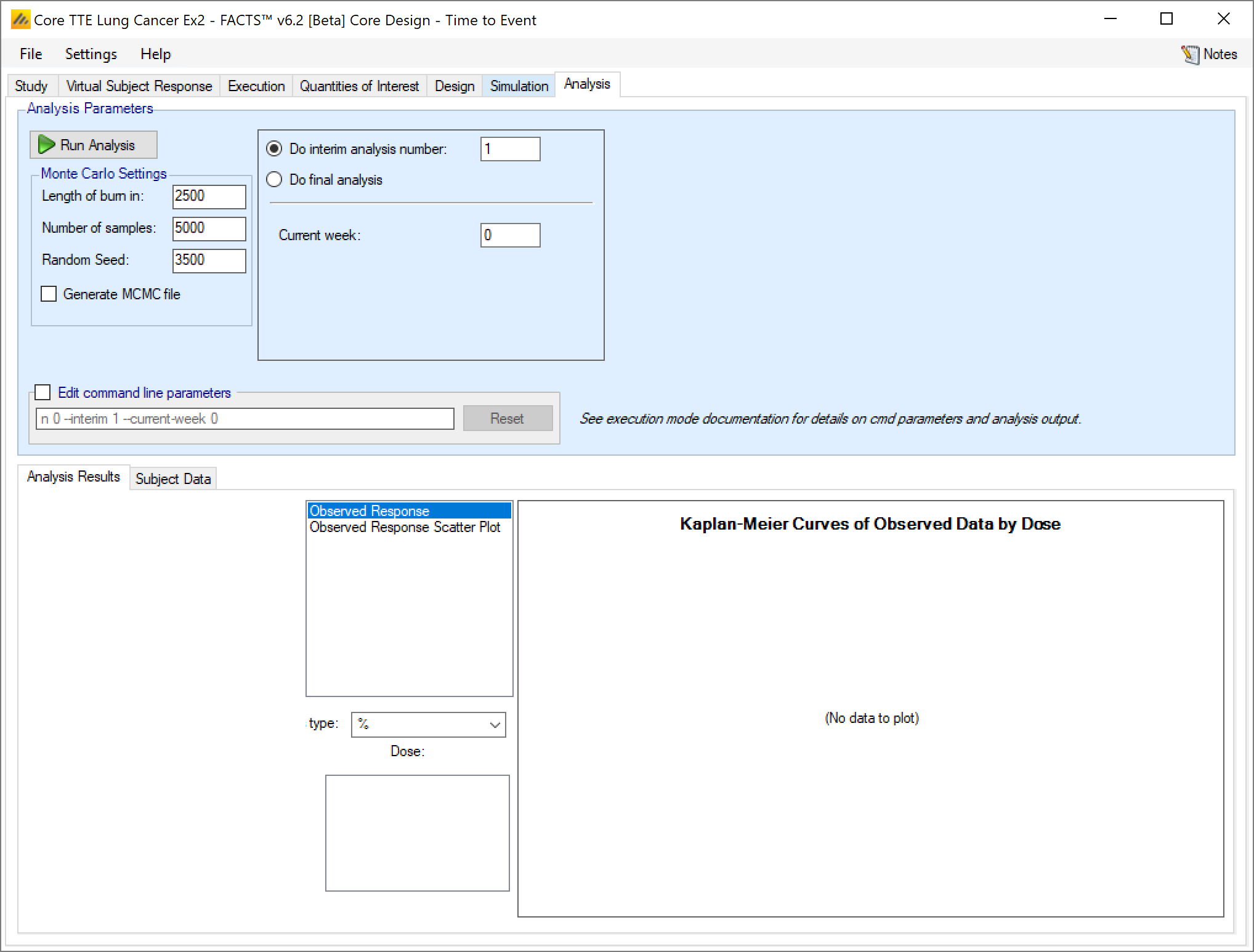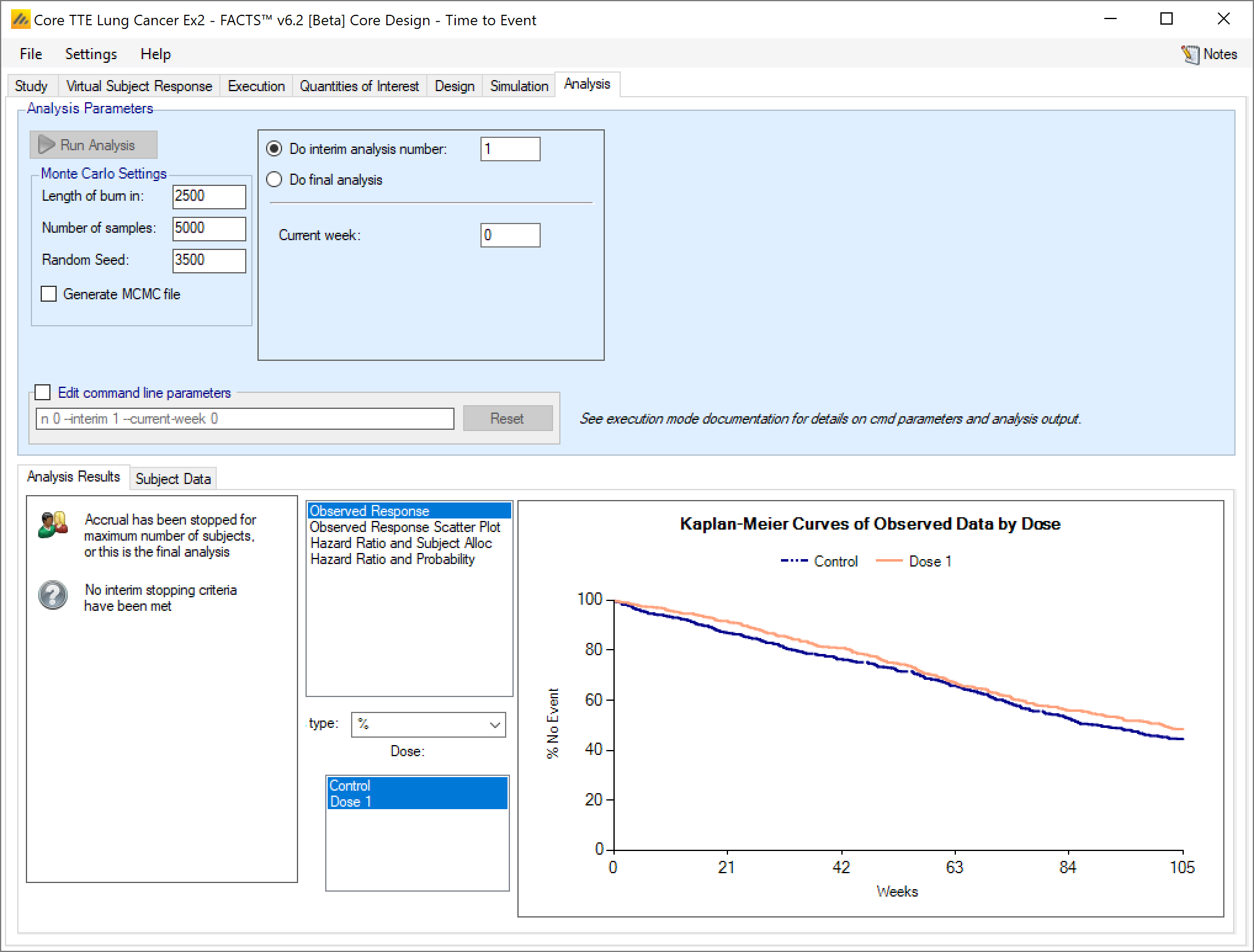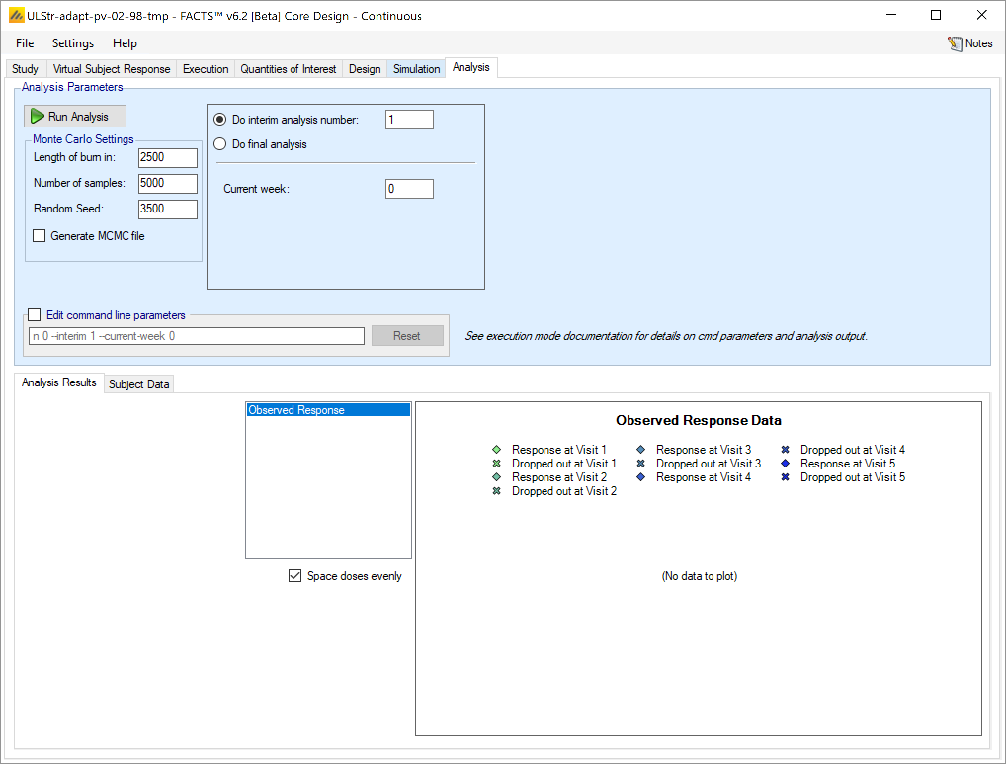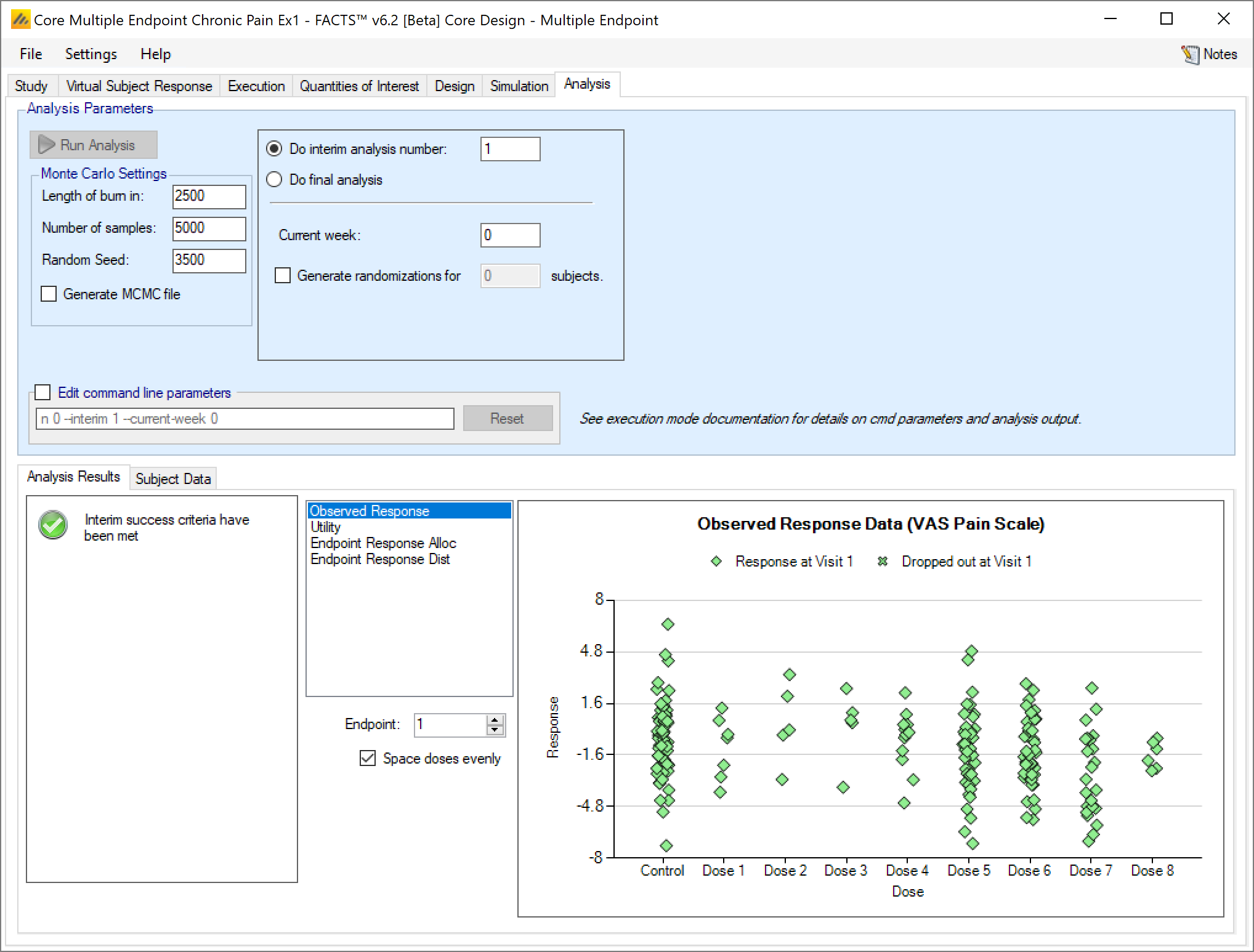 If this is an arm dropping design, it is possible to flag which, if any, doses have already been dropped and hence to be excluded from future adaptation decisions, but included in the analysis [this can be used even if the design is not an arm dropping design – to allow for an arm being dropped for reasons outside the scope of the simulation, such as logistical or safety reasons but only be entering the ‘-armsdropped’ command line parameter the control is only displayed if the design includes arm dropping].