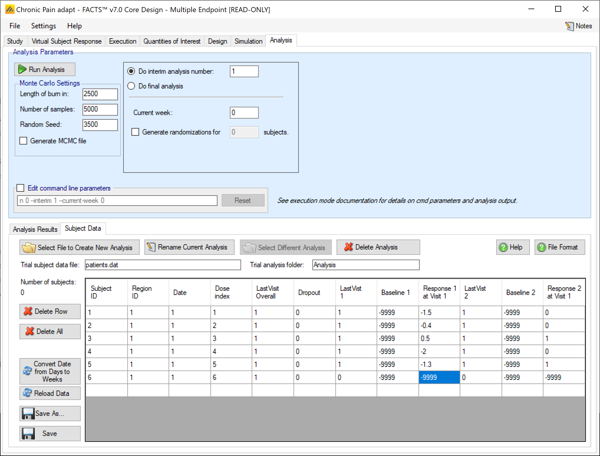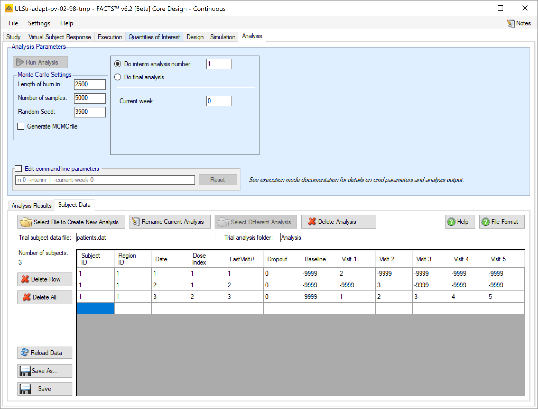 - Last Visit# is the index of last visit for which there is data for the subject. Previously FACTS could not process data with data missing from visits before the last visit. From FACTS 6.2 this is now possible. Visits for which no data is available should be given the value “-9999”. Data supplied for a subject’s visits after ‘Last Visit#’ is ignored.