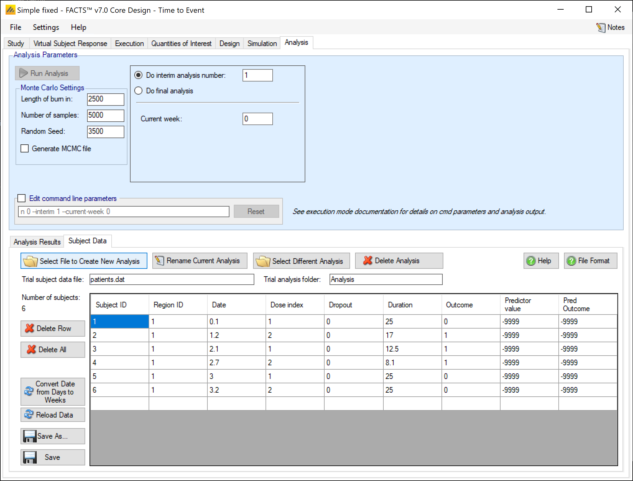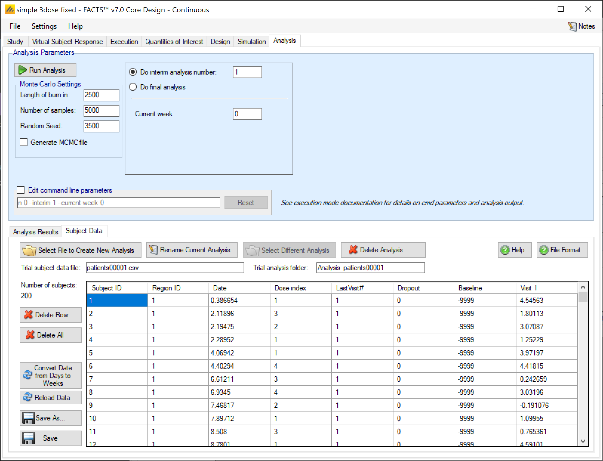 - Date is a real number indicating when the subject was recruited in weeksThis value is in weeks from FACTS 7.0 onwards, before that it was in days. from the start of the trial. It is output from FACTS simulation, it is not used in analysis. If a date is not available there is no harm simply entering ‘1’ for each subject.
