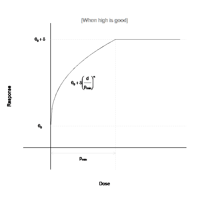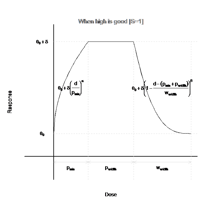 Let doses \(d=d', \ldots, D\) be doses in the dose response model and \(\theta_d\) be the estimated dose response for dose \(d\). The initial dose \(d'=1\) if there is no control or control is included in the dose response model, and \(d'=2\) if the control arm is modeled separately.