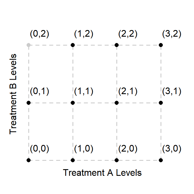 Note: that not all combinations of \(r\) and \(c\) will have data associated with them. However, FACTS will still evaluate the prior at all combinations. Thus, in the situation depicted below where the grayed-out point indicates a treatment combination with no allocation, \(\theta_{1,2}\) is not modeled conditioned only on \(\theta_{1,1}\). \(\theta_{0,1}\) also informs on \(\theta_{1,2}\) via \(\theta_{0,2}\).