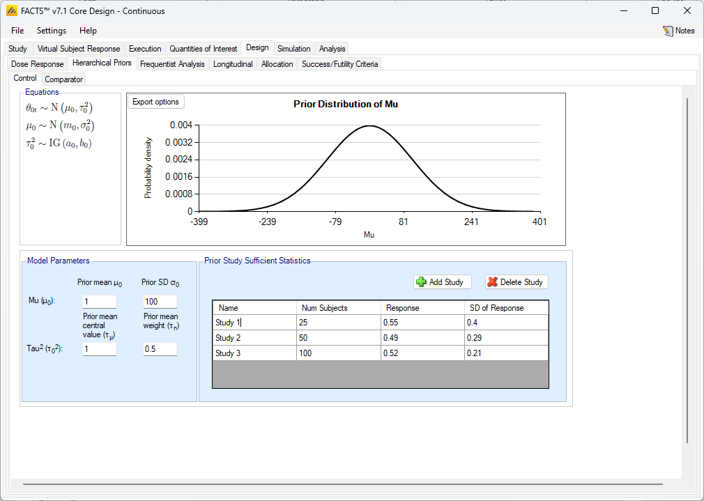If a hierarchical prior is used for either the Control or Active Comparator arm, then FACTS will estimate a prior for that arm using external data that the user provides. This prior is estimated through a hierarchical model, and then the in-study data collected on subjects randomized to that arm are used to estimate the posterior distribution for the arm.