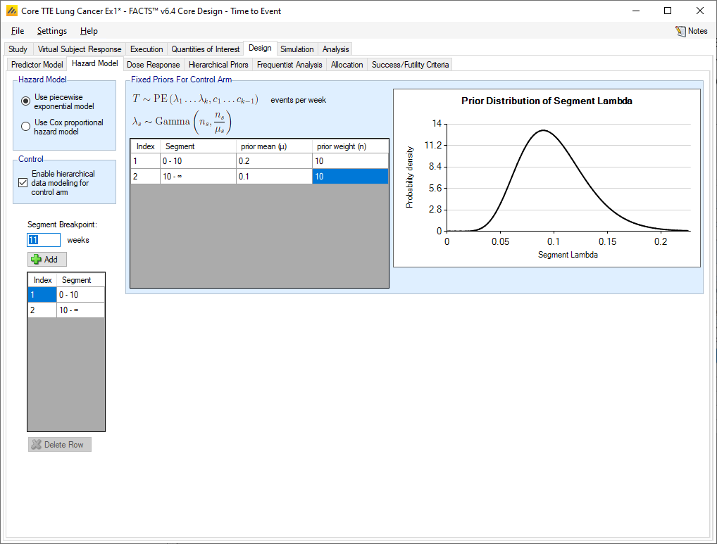 If “Enable hierarchical data modeling for the control arm” is not selected, then independent gamma distributions with parameters specified in Hazard Rate tab’s table are used. The gamma parameters have been reparameterized so that the mean hazard rate and a weight (in terms of number of events) are provided instead of the traditional \(\alpha\) and \(\beta\) parameters.
