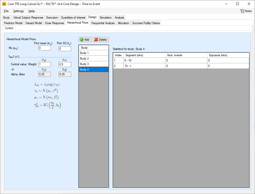 The additional data comes in the form of sufficient statistics from an outside data source. The sufficient statistics are, for each segment in each study, the number of events on the control arm and the control arm exposure time in subject weeks. The information from the prior study can be ‘down-weighted’ by reducing, pro-rata, the number of events and exposure time before entering them. By supplying the summary statistics from previous trials and specifying the parameters for prior distributions for the parameters of a hierarchical model, the gamma priors are updated and become the priors applied to the data collected on the virtual subjects.