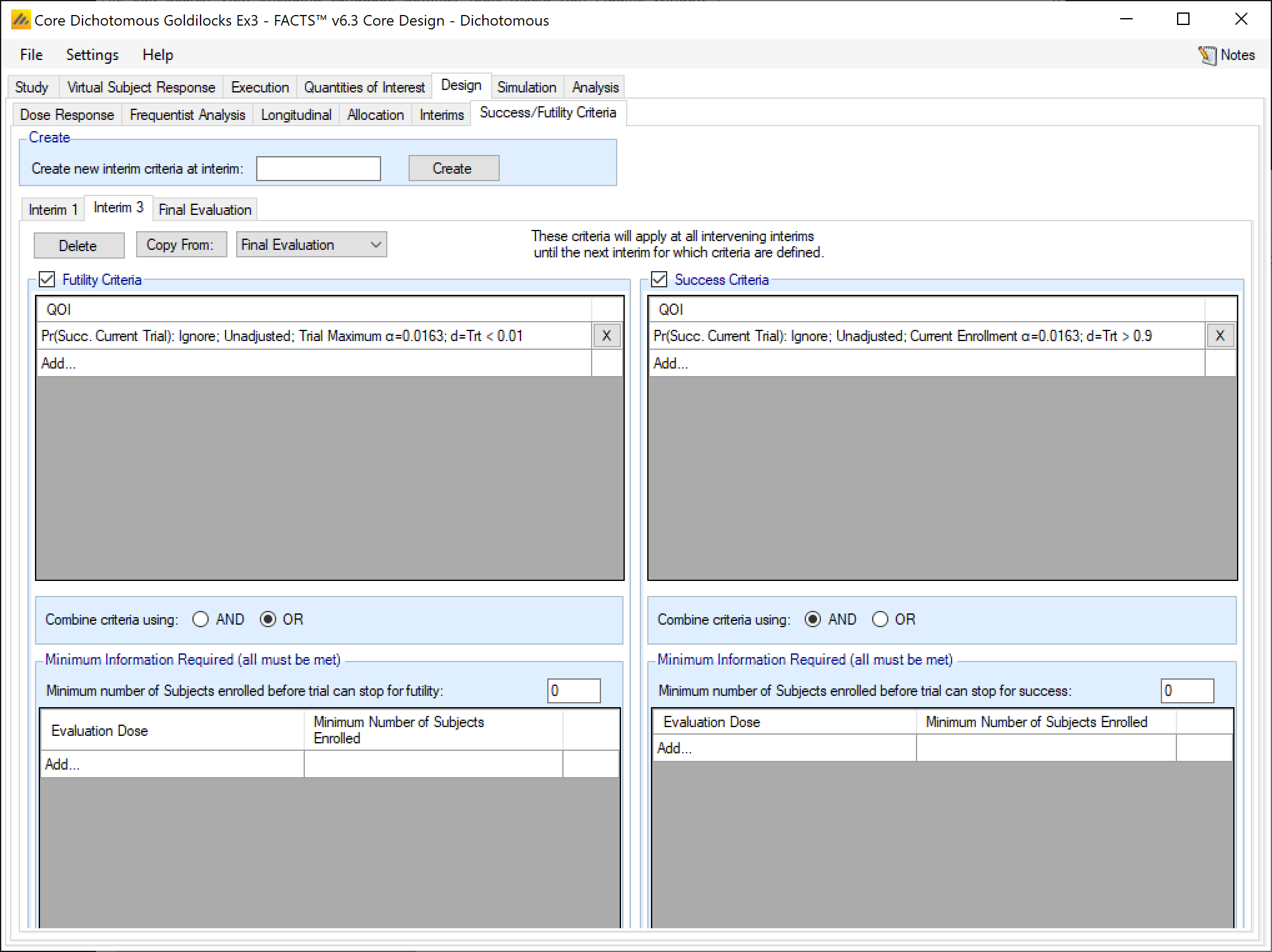 On the success/futility criteria of a design with “Enable adaptive features” checked on the Study > Study Info page, the user can specify rules for judging the study for futility or success at an interim and at the final evaluation. If the trial has no interims there will be just a tab for the Final Evaluation criteria. If the trial has interim analyses, then there can be tabs that define different early success/futility criteria at the different interims.