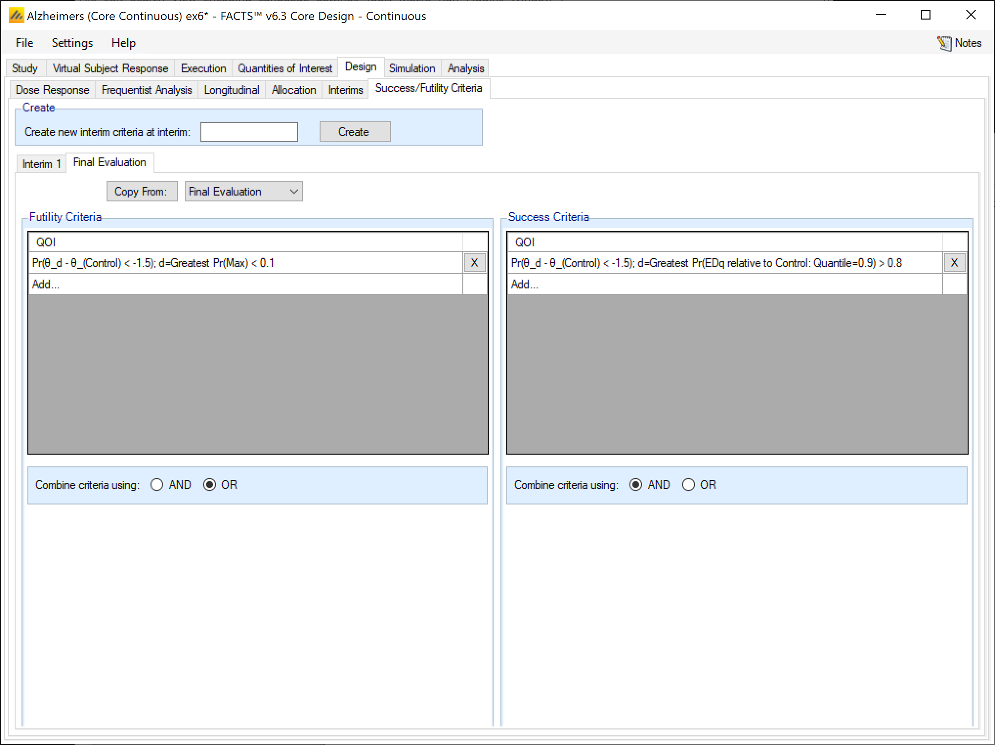 To add a decision rule, click the “Add…” button within the appropriate column, select a decision quantity QOI, a comparison inequality sign, and a threshold. Final success and final futility criteria can each have multiple components to them, and the selection at the bottom of the column called “Combine criteria using:” dictates if success or futility should be declared if every single criteria is met (AND) or if any criteria is met (OR).