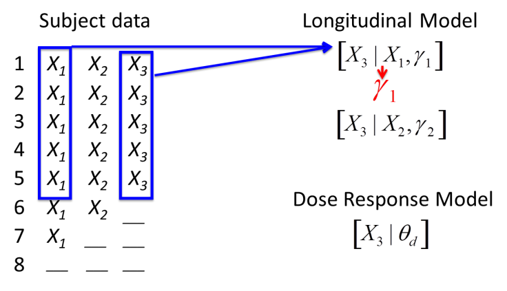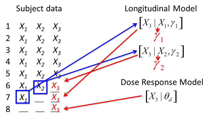 Subjects with missing final data have final data sampled from the posterior distribution of the longitudinal model given the subjects most recent intermediate visit (or in some models, all their available intermediate visit data). Subjects with no final or intermediate data have final data sampled from the posterior distribution of the dose response model given the dose arm the subject was allocated to.