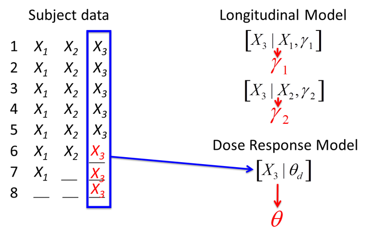 The missing final endpoint values are imputed with the uncertainty in the longitudinal model, and, as a result, the dose response model is estimated including both the uncertainty in the longitudinal model and the usual uncertainty in its parameters.