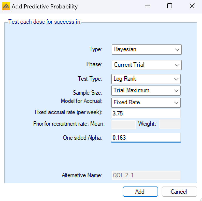 Unlike the Continuous and Dichotomous endpoints, to predict the probability of success at full enrollment with a Time-to-Event endpoint, it is also necessary to simulate the accrual rate (and hence how many events might be observed).