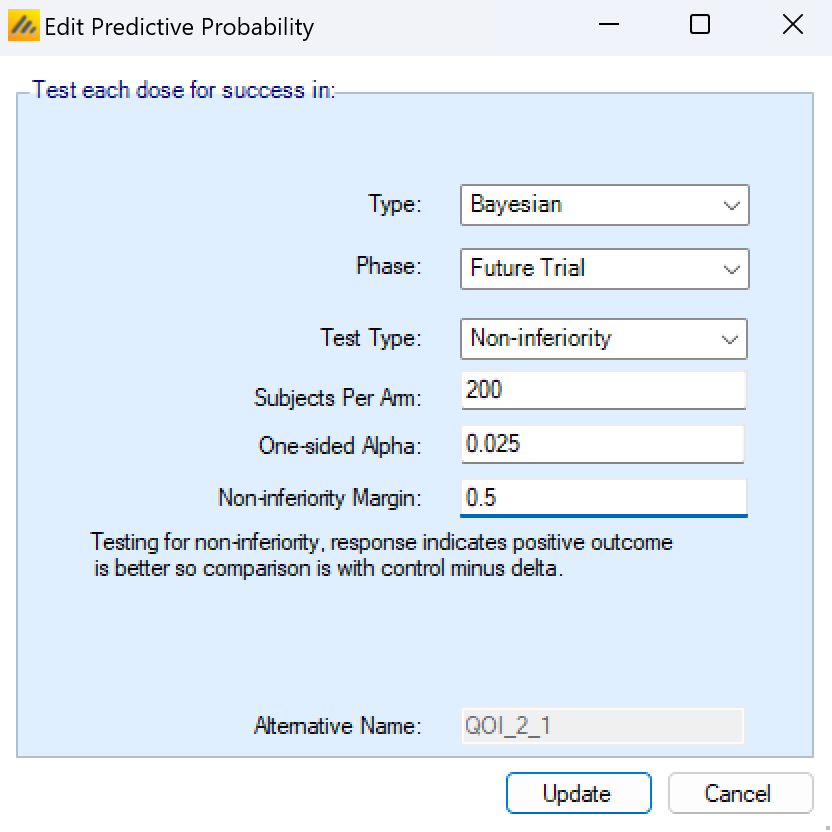 The test type of the future trial can be set to Superiority or Non-inferiority. If the superiority or non-inferiority margin is set to 0, then both types of tests simplify to traditional tests of superiority with no margin. If a non-zero margin is set, then the future trial must meet the success criteria indicated by the test type and the margin. The margin cannot be negative, but a super superiority test with a margin of -0.5 is equivalent to a non-inferiority test with a margin of 0.5.