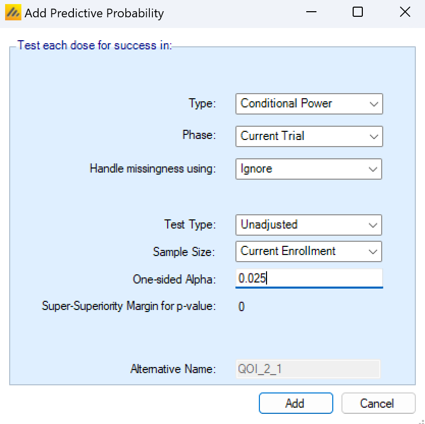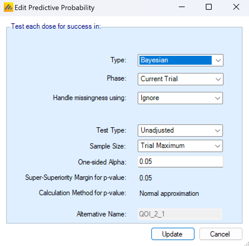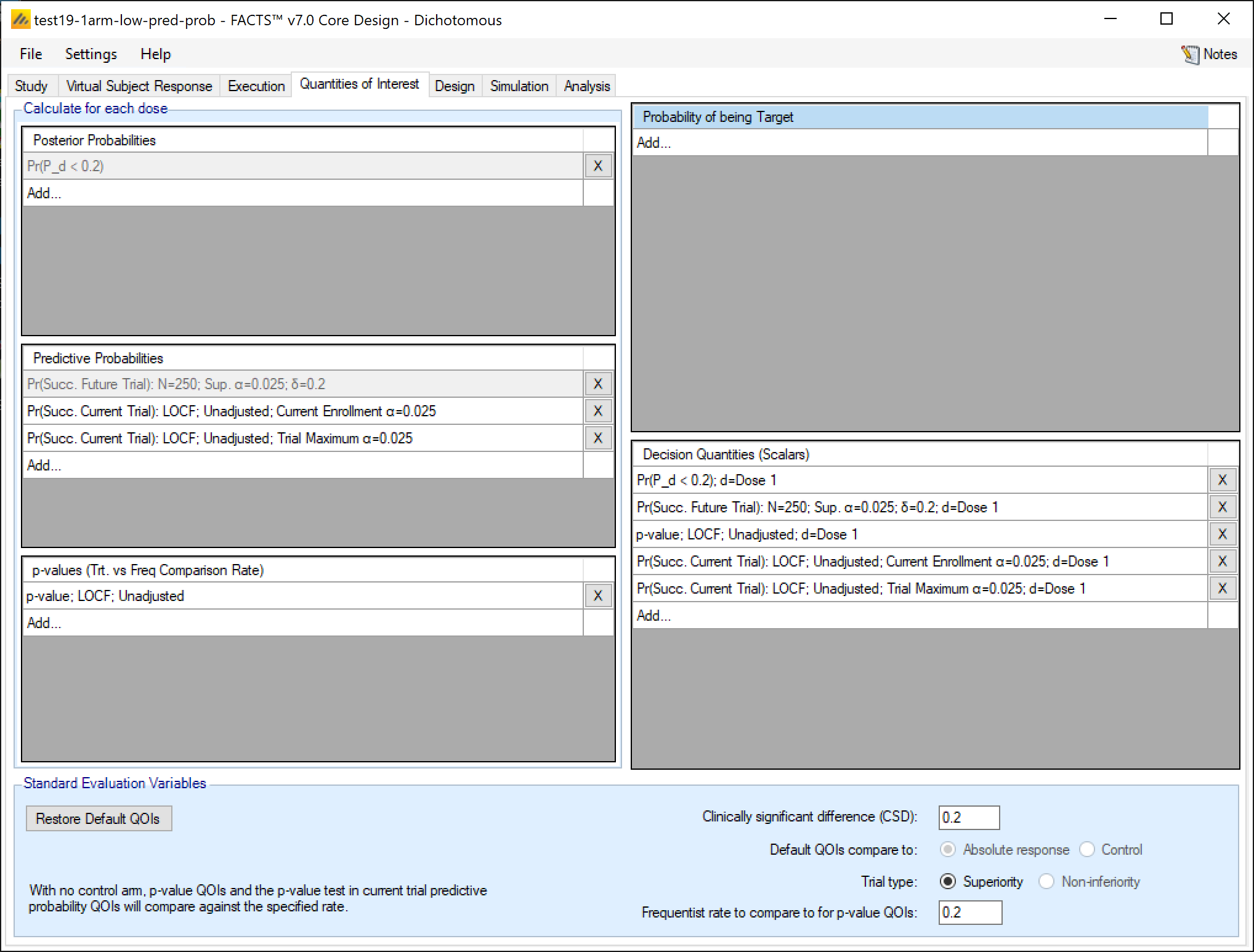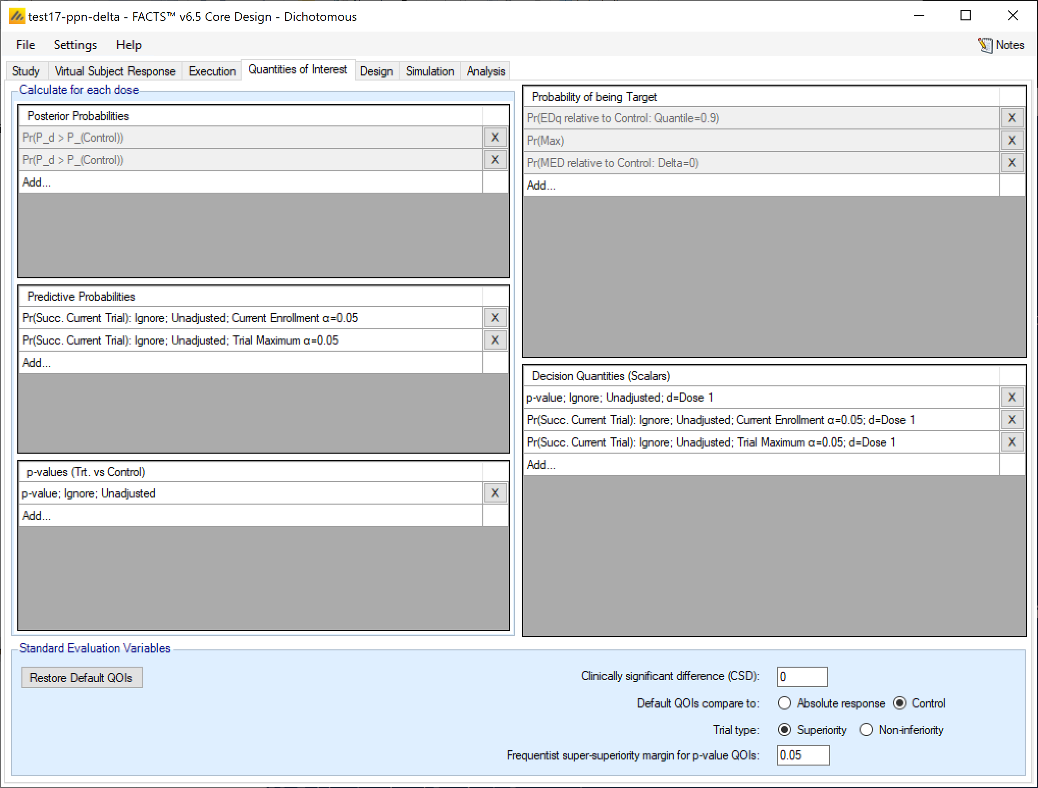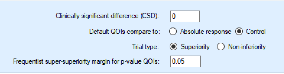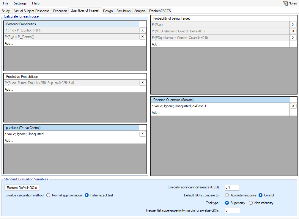The QOI (Quantities Of Interest) tab allows the user to specify the Bayesian posterior quantities and frequentist p-values that are eligible to be used to make decisions in the trial as well as being output to the simulations results files.