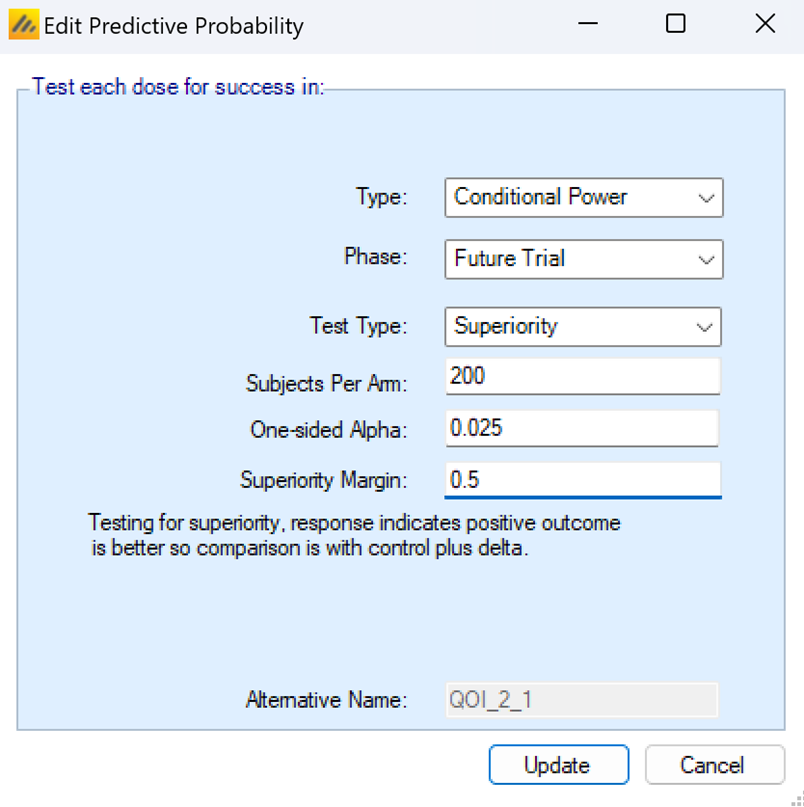 - The probability of success in a future trial Pr(Succ. Future Trial): N=\(N_{Future}\), Sup/Noninf, \(\alpha=\alpha^*\); \(\delta=\delta^*\), previously referred to as Pr(S Phase III) and Prob. Stat Sig in earlier versions of FACTS. The parameters for the future trial can be modified from the default by clicking on the QOI’s row in the table.