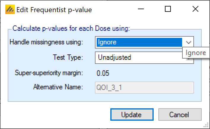 The user specifies how missingness is handled in the final analysis, the p-value test type – unadjusted, Bonferroni or Dunnett’s (Dunnett 1955) and the (one sided) alpha level for the significance test. The QOI assumes that the specified default p-value delta is used in the final test.