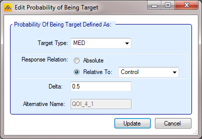 The QOIs described so far have defined values to be calculated across all doses. For a Success/Futility decision to be made it is necessary to specify the treatment arm whose QOI value is to be used in comparison to the success and/or futility criteria. This selection can be done by specifying a specific arm, but normally it is specified by using a “Probability of being Target” selection criteria. A simple and common example is “The probability of the response being better than that of the Control of the Treatment arm with the maximum response”: