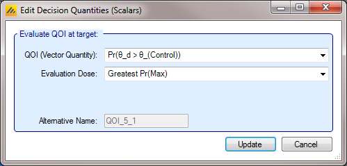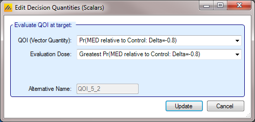 Instead of a Target Dose QOI, it is also possible to specify a specific dose, or to use the terms “Max probability over all doses” and “Min probability over all doses” which mean that the dose with the minimum or maximum value of the per dose QOI is used. This enables: