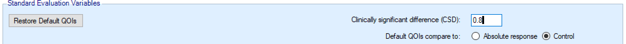 The probability of being better than the control arm by a clinically significant difference Pr(\(\theta_d - \theta_{Control} > \delta^*\))”, previously referred to as Pr(\(\theta_d – \theta_0 >\) CSD), Pr(CSD) and Prob. Beats CSD in earlier versions of FACTS. The value for the \(\delta^*\) is the CSD, which is set in the “Standard Evaluation Variables” panel at the bottom of the QOI tab.