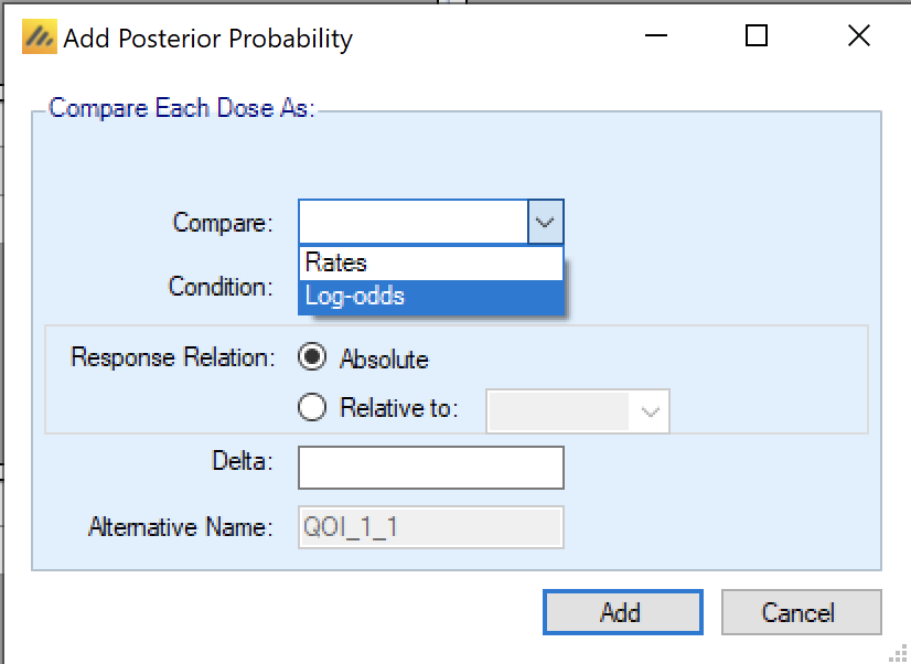 These adjustments are not made for other user entered QOIs. The directions of comparison both for the definition of the probability to be calculated and the comparison of the resulting probability with a threshold are under the user’s control, as are whether delta’s are negative or positive. This allows the user to define QOIs in whatever fashion is natural to them and their team.