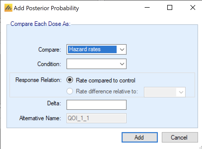 First, in FACTS Core TTE a Posterior Probability QOI (a Bayesian comparison of estimates of response) can be used to compare Hazard Ratios or Hazard Rates. In their descriptions Hazard Ratio QOIs use “HR” (e.g. “HRd < 1”) and Hazard Rate QOIs use \(\lambda\) (e.g. “\(\lambda_d\) < \(\lambda_{control}\)”). If there are hazard rate QOIs defined, then FACTS restricts the hazard model (defined on the Design > Hazard Model tab) to use just a single segment (so that there is just one lambda to compare). This is set in the “Com are” box of the QOI definition window: