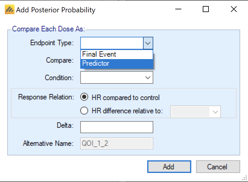 Additionally, in FACTS Core TTE when defining a Posterior Probability QOI (a Bayesian comparison of estimates of response) or a Target QOI (a Bayesian assessment of which treatment arm is most likely to fulfill a ‘target’ criteria) – the user can select whether the evaluation uses the Final Event endpoint, or the Predictor.