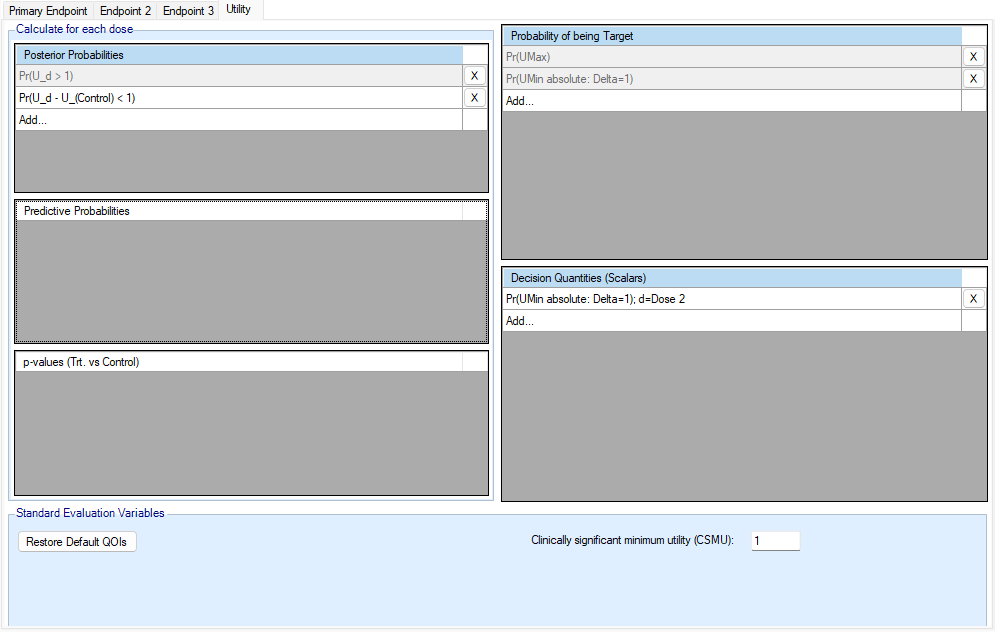 The standard evaluation variables section of the QOI tab only contains an entry for the Clinically significant minimum utility (CSMU). This value only changes the value of the default posterior probability utility QOI that is created automatically.