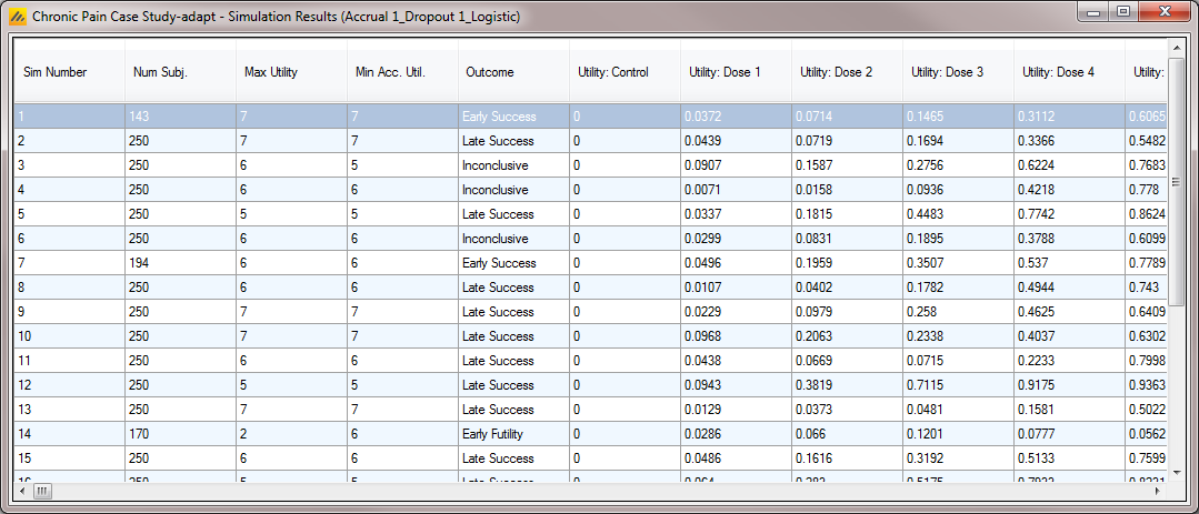 | Mean Utility (<Endpoint>): <Dose> | One per arm | This is the mean (over the simulations) of the posterior estimate of the utility of this endpoint on this dose. |