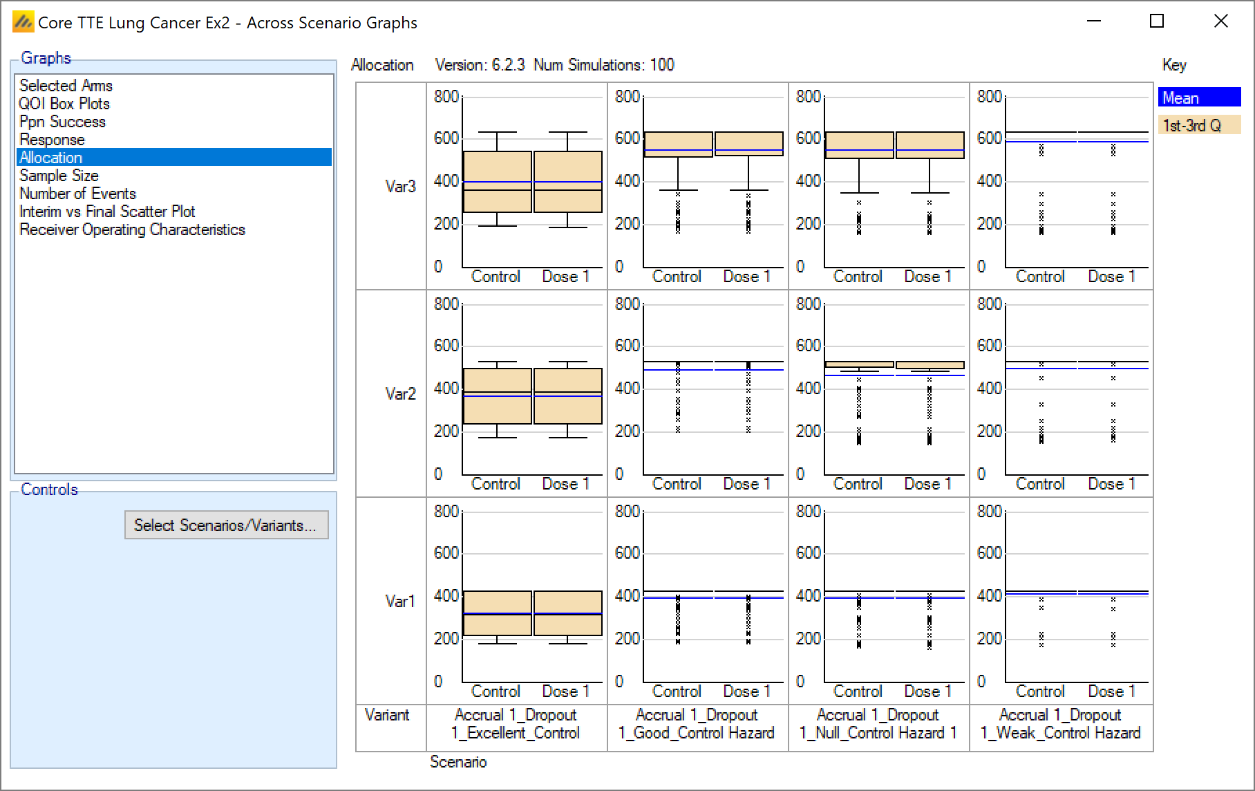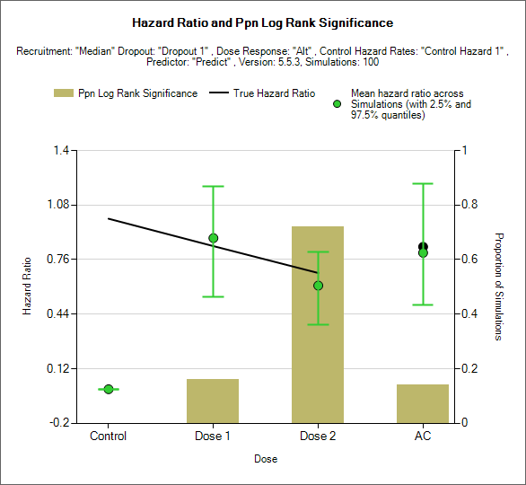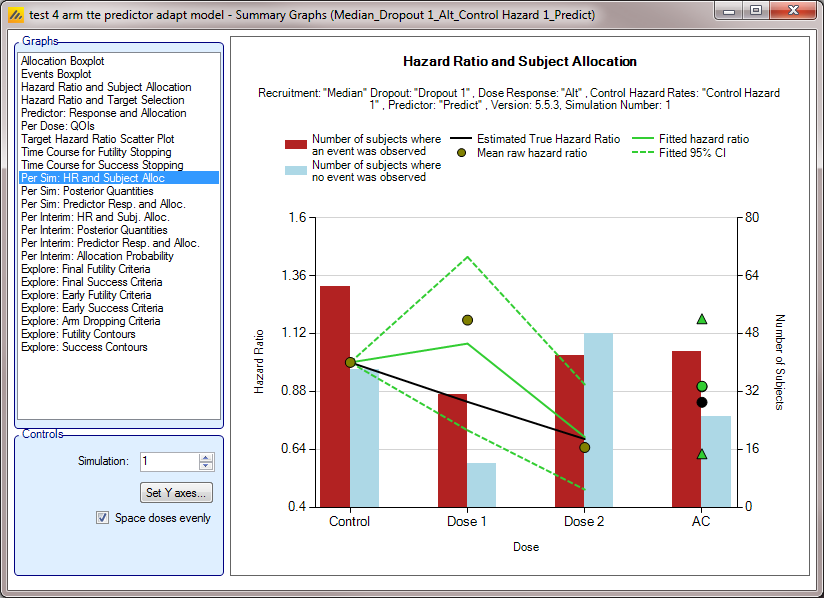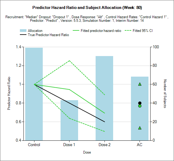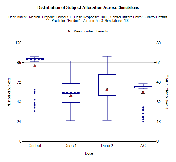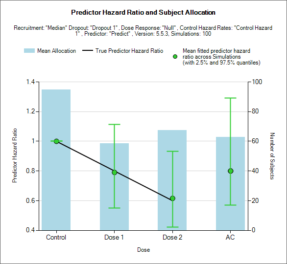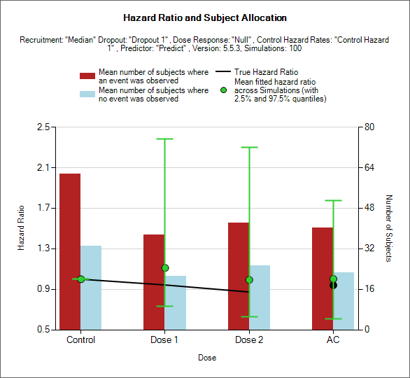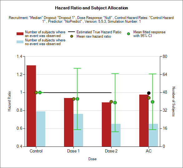 This graph shows for each treatment arm, the mean subject allocation, mean number of events observed and the mean estimated hazard ratio. Specifically: