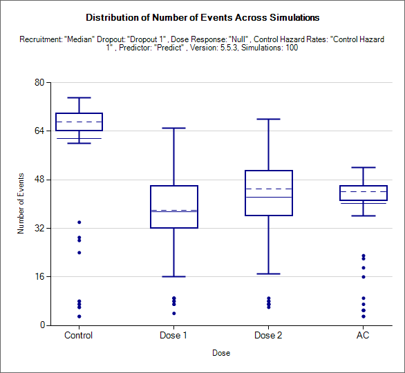 - The distribution over all simulations of the number of events observed in each arm shown as a box and whisker plot.