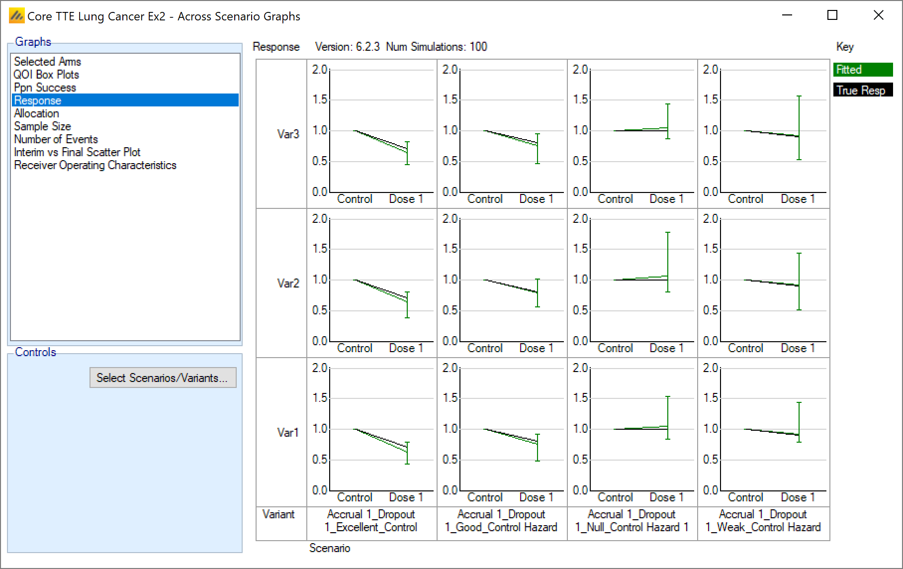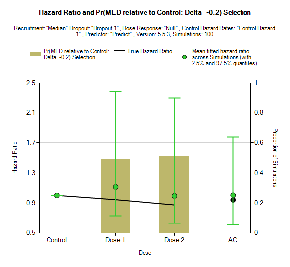 | True Predictor Mean resp <dose> | D | ✔ | ✔ | The true mean predictor response being simulated for each treatment arm (mean of a continuous predictor, response rate of a dichotomous predictor and the hazard ratio of a time-to-event predictor) |