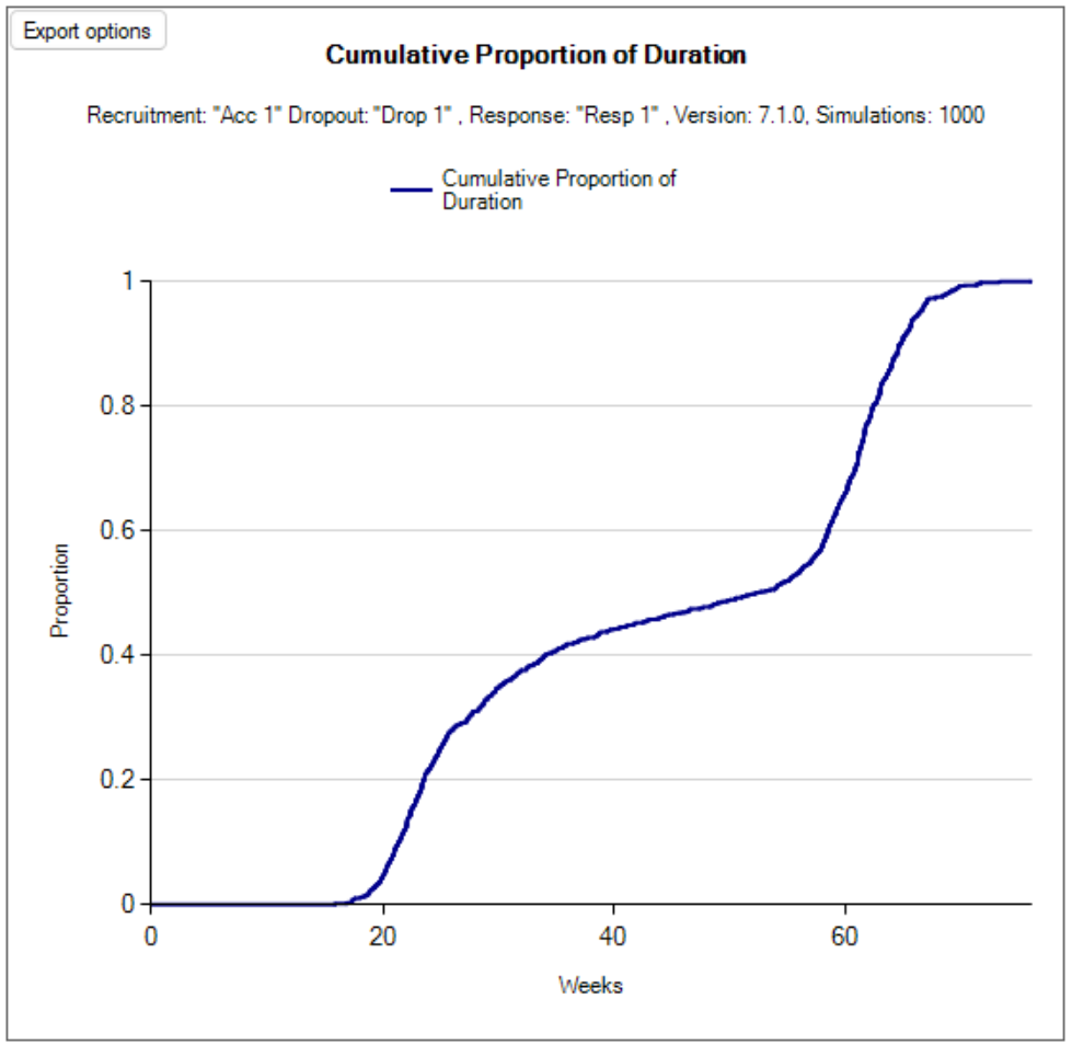 There are two graphs, one that shows the cumulative proportion of durations across all simulations, and the other shows the cumulative proportion of subjects across all simulations.