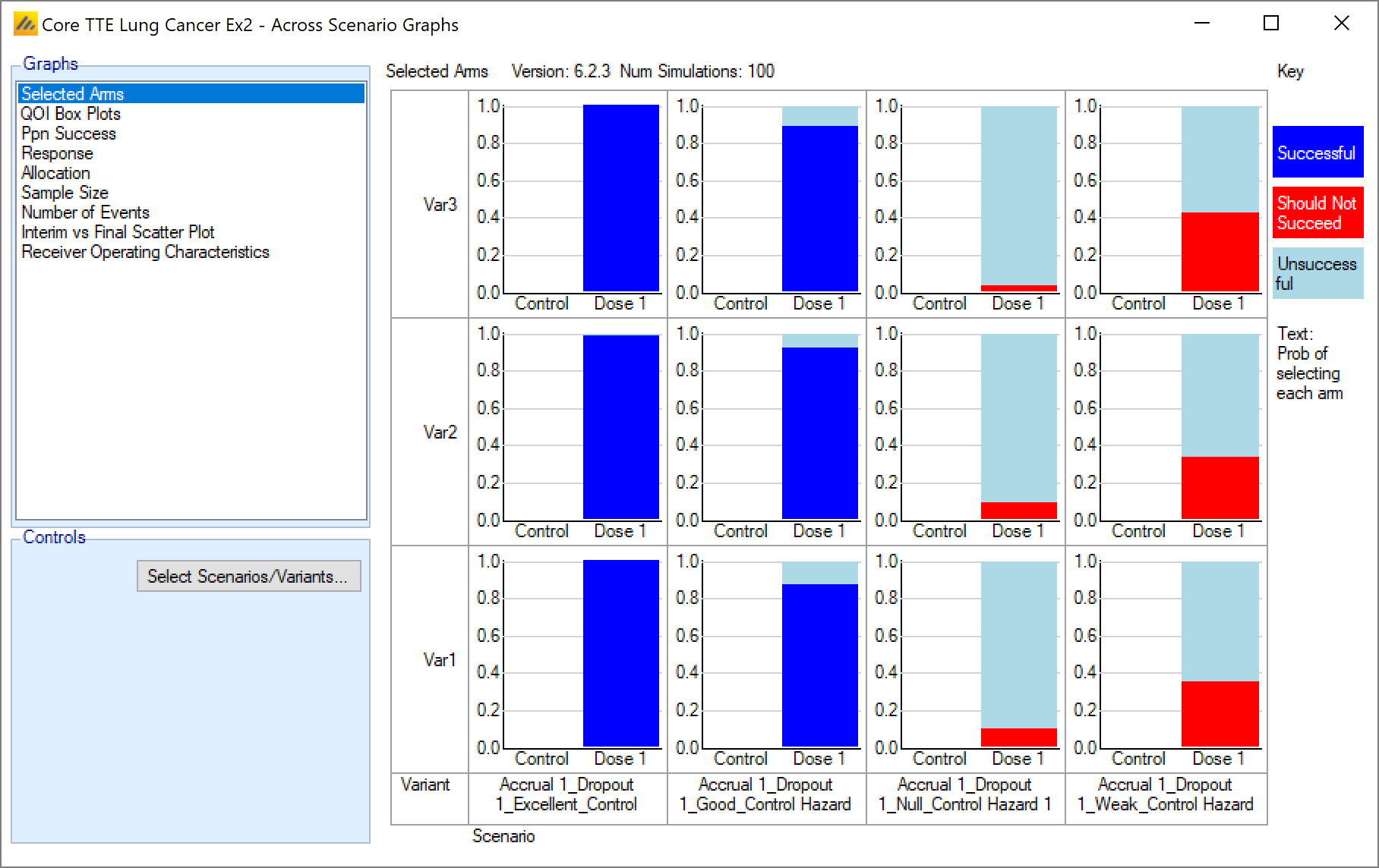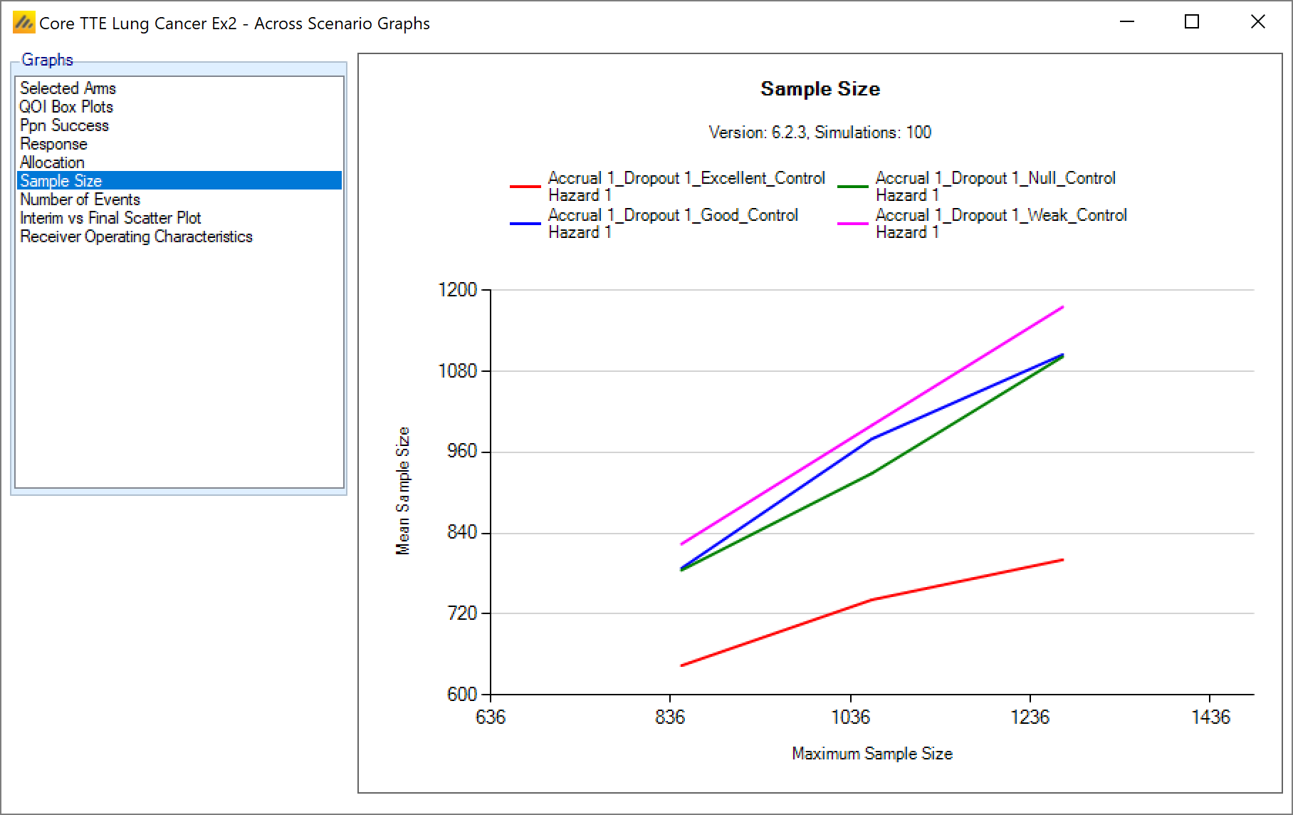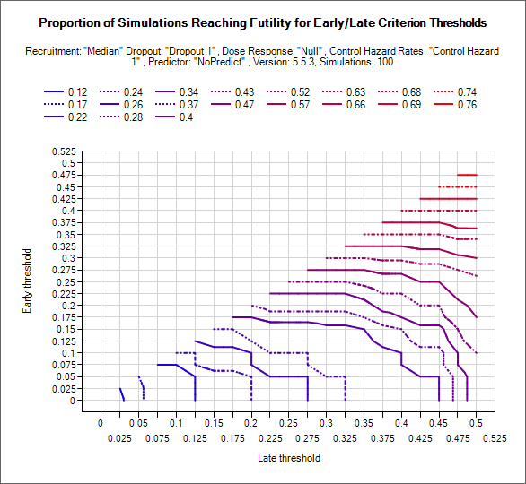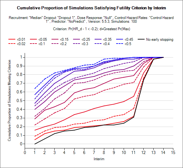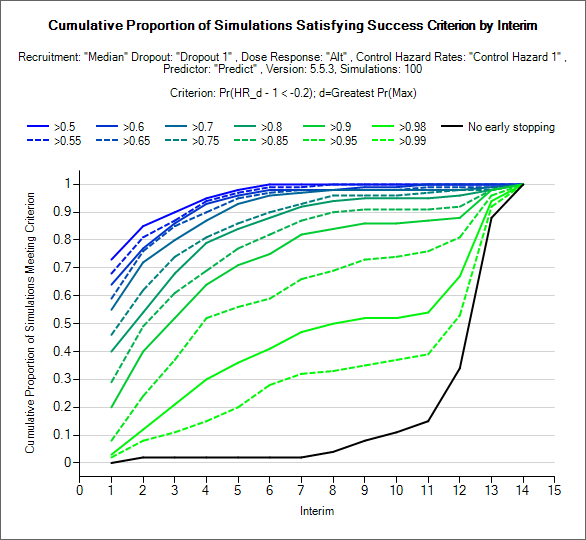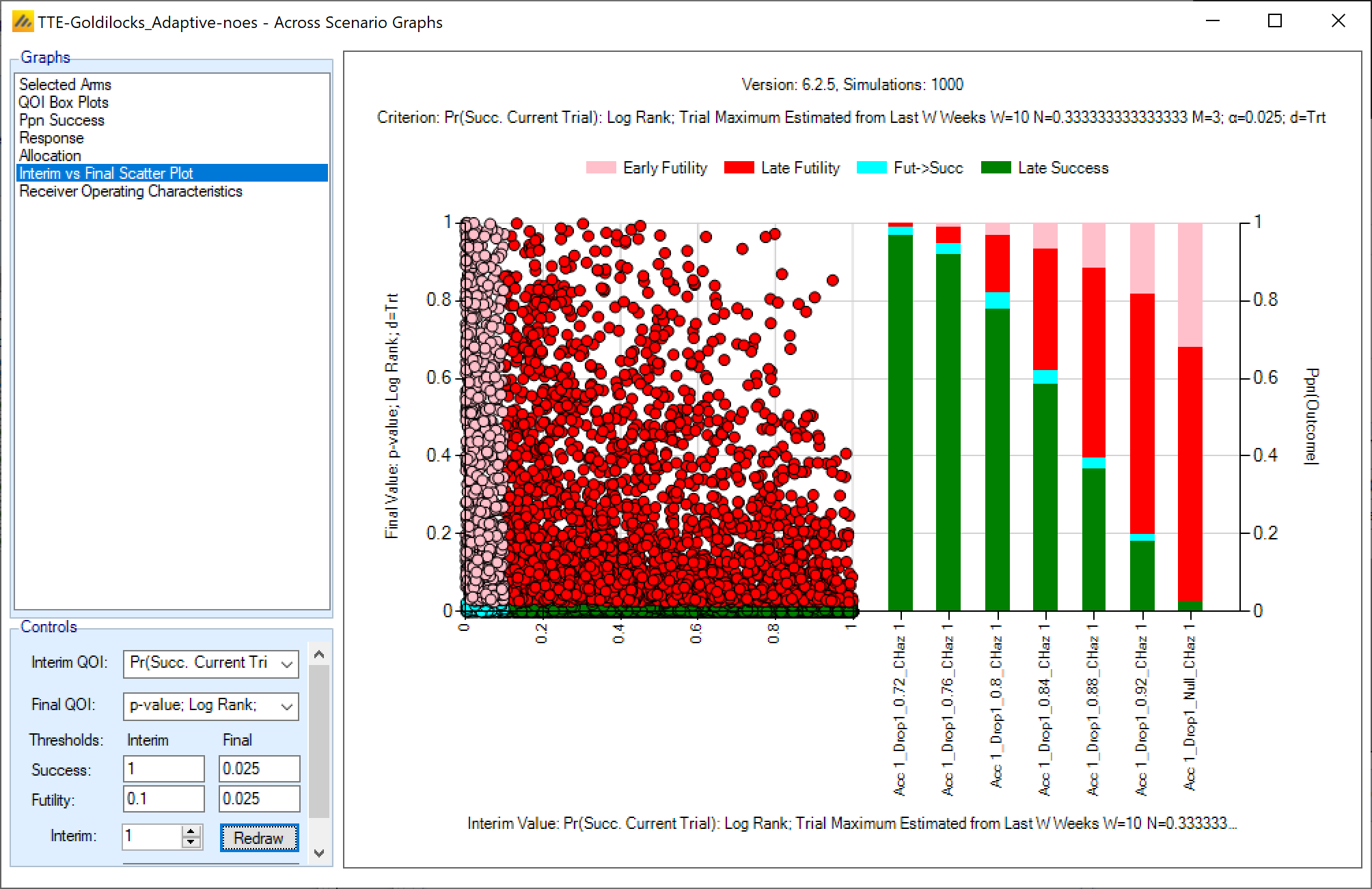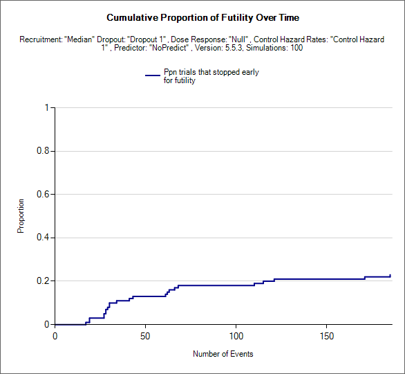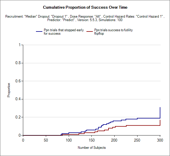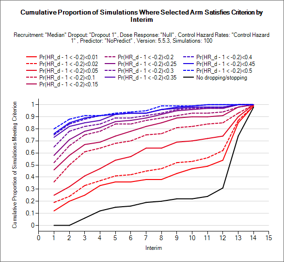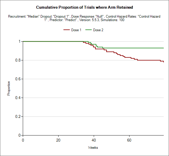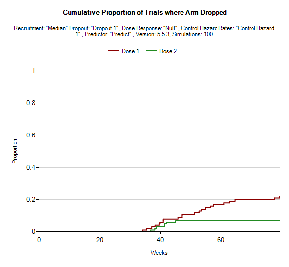 This graph shows, for each arm, the cumulative proportion of simulations when it was dropped. The user can select whether time or number of subjects allocated to the arm is used as the x-axis.