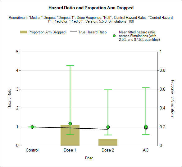 The green dashed line (drawn if a response model is fitted), shows the mean of the estimated hazard ratios across the simulations