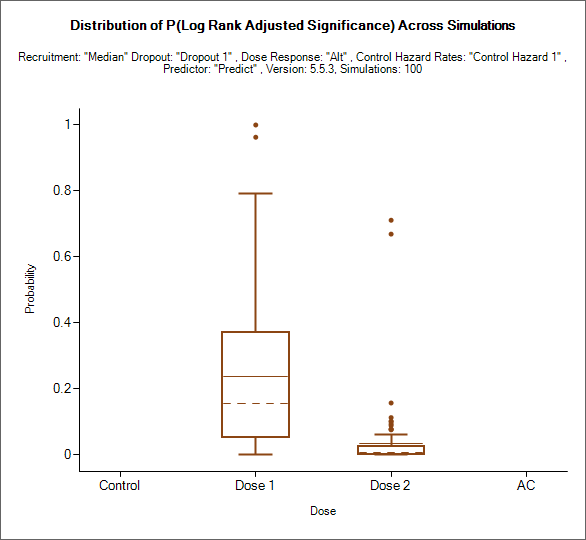 These graphs are the box and whisker plots of various p-values that are automatically calculated (that is to say they do not need to be defined as QOIs for them to be calculated) for the final analysis. The user can select from Unadjusted, Bonferroni and Dunnett's and LOCF, BOCF (if baseline is simulated) or PP (per-protocol) treatment of missing values.