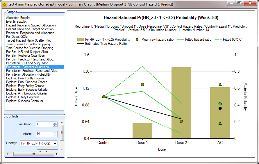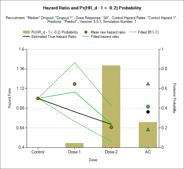 These plots show the true simulated hazard ratio (without allowance for the effect of the predictor) and the mean and 95% spread of the mean fitted hazard ratios along with bars showing the proportion of simulations the different treatment arms are the finally selected target. The target displayed is selected by a control on the graph, from any of the defined Target QOIs.:
