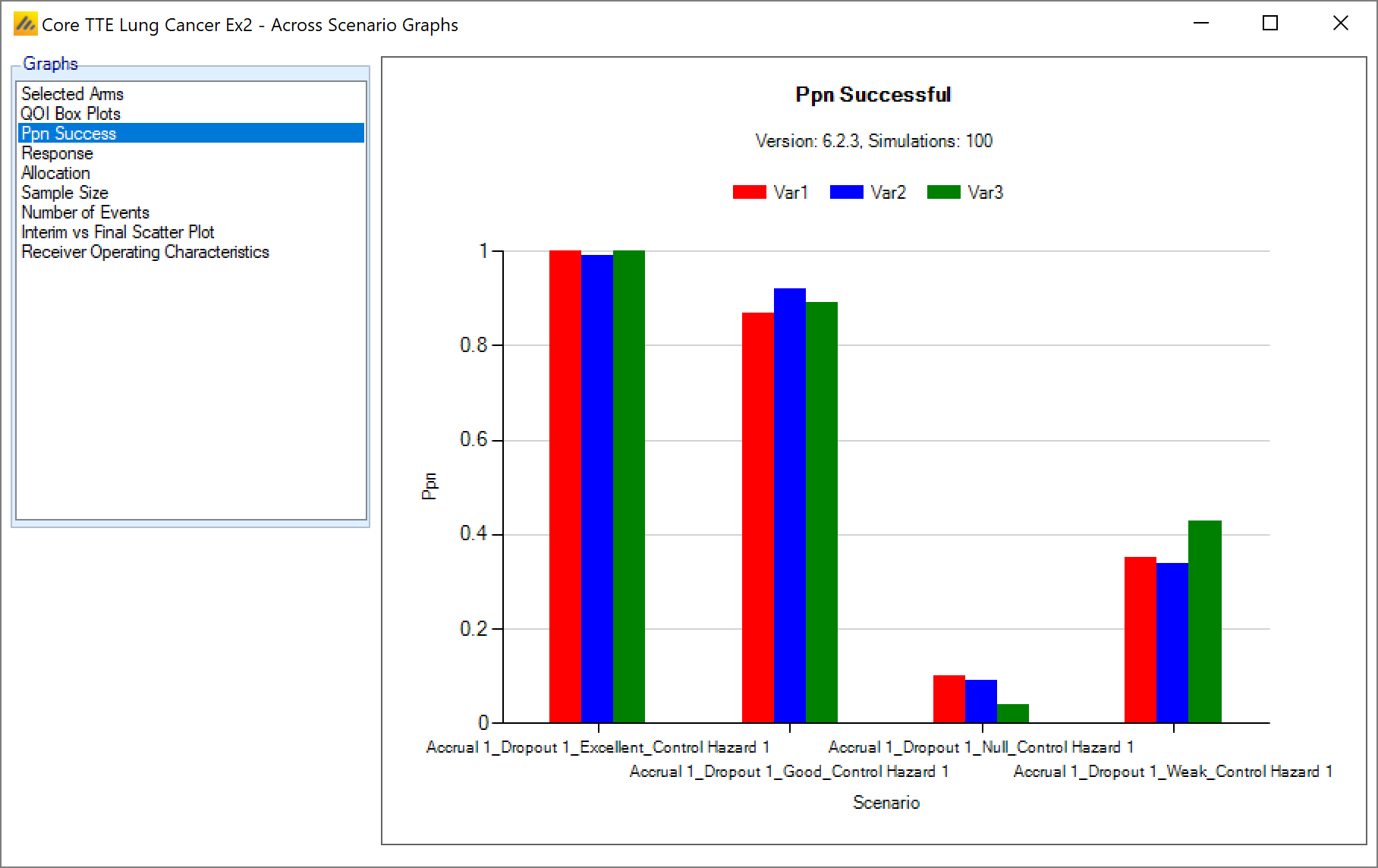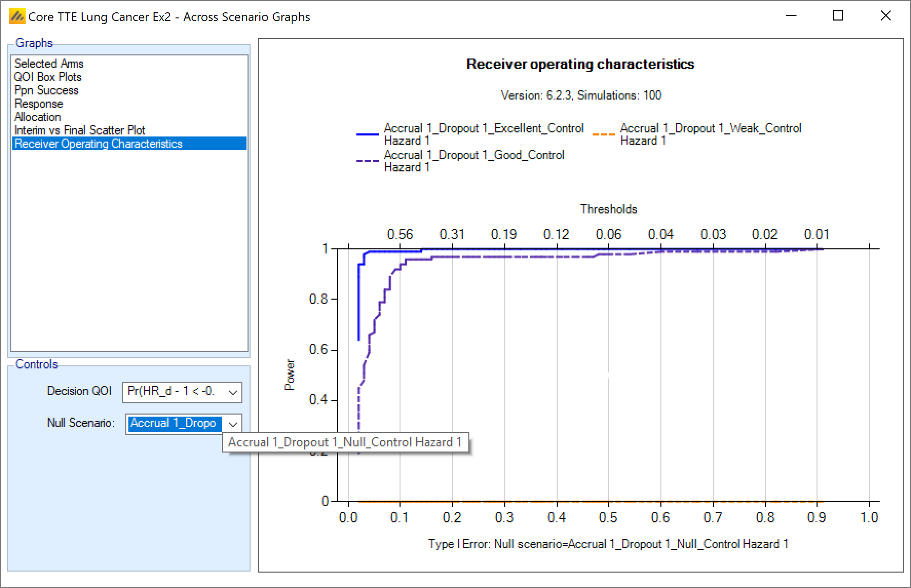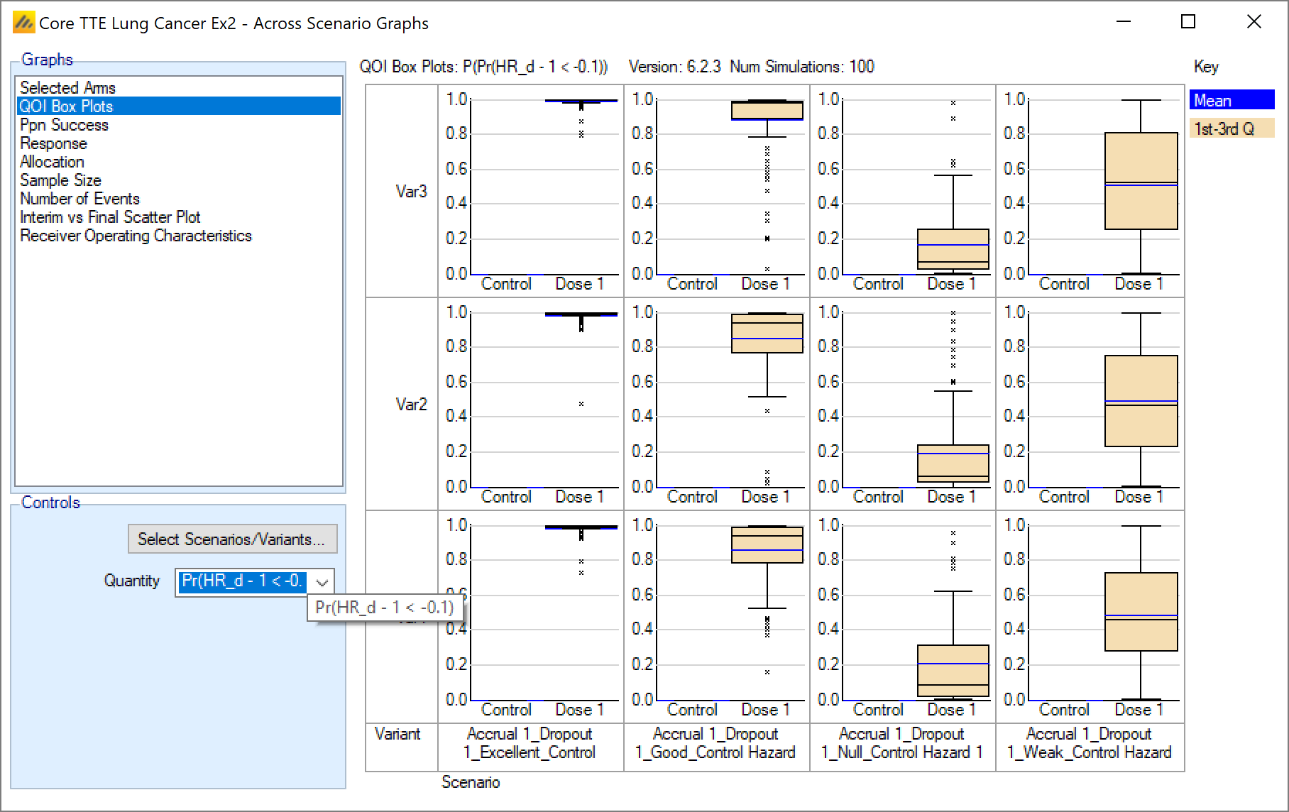 Which QOI is displayed can be selected by the user from a drop down list on the graph. Any of the Posterior Probability, Predictive Probability, P-value and Target QOI’s can be selected.