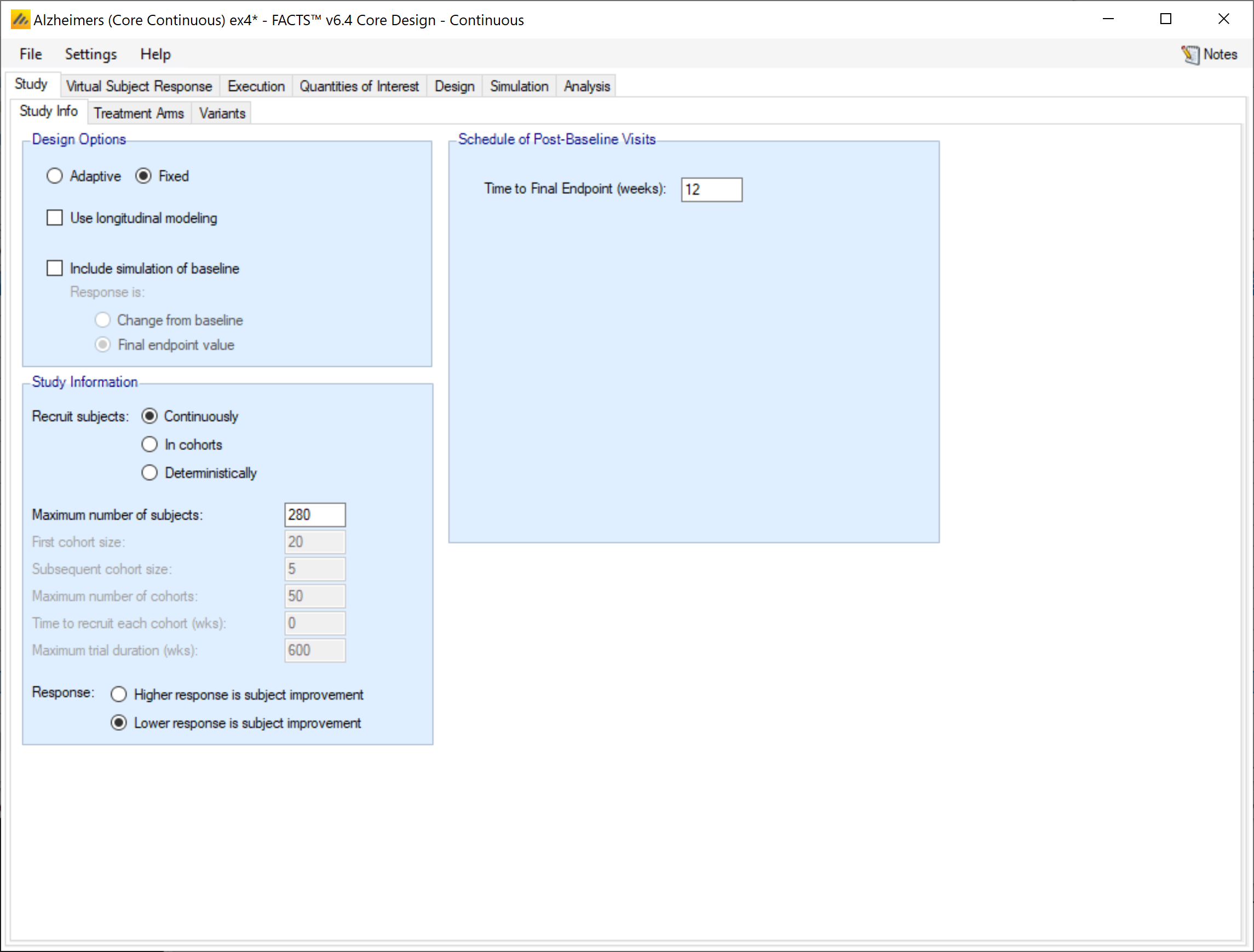 If “Use longitudinal modeling” is not checked, then the post baseline visit specification is simple. The only required entry is the time it takes to observe a subject’s final endpoint.