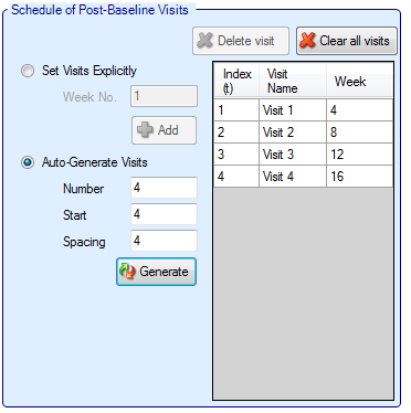 If “Use longitudinal modeling” is checked, the follow-up period for subjects is slightly more involved. Visits are specified one at a time, by entering the required week value for the visit and then clicking ‘Add’, or by specifying a regularly spaced sequence: select ‘Auto-Generate’, enter the number of visits, the week of the first visit and the number of weeks between each visit and then click ‘Generate’.