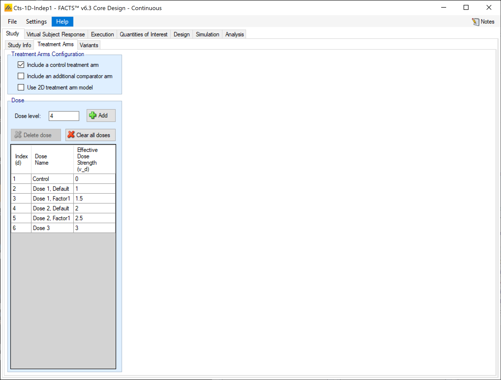 As with all FACTS Core engines, the Treatment Arms sub-tab provides an interface for specifying the various dose levels, Control and Additional Comparator arms, and whether using a 2D treatment arm model.