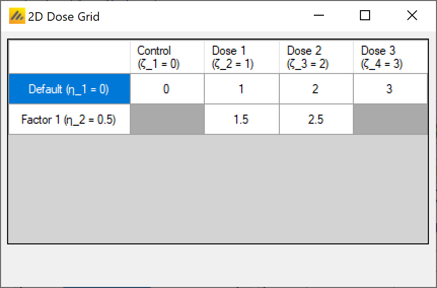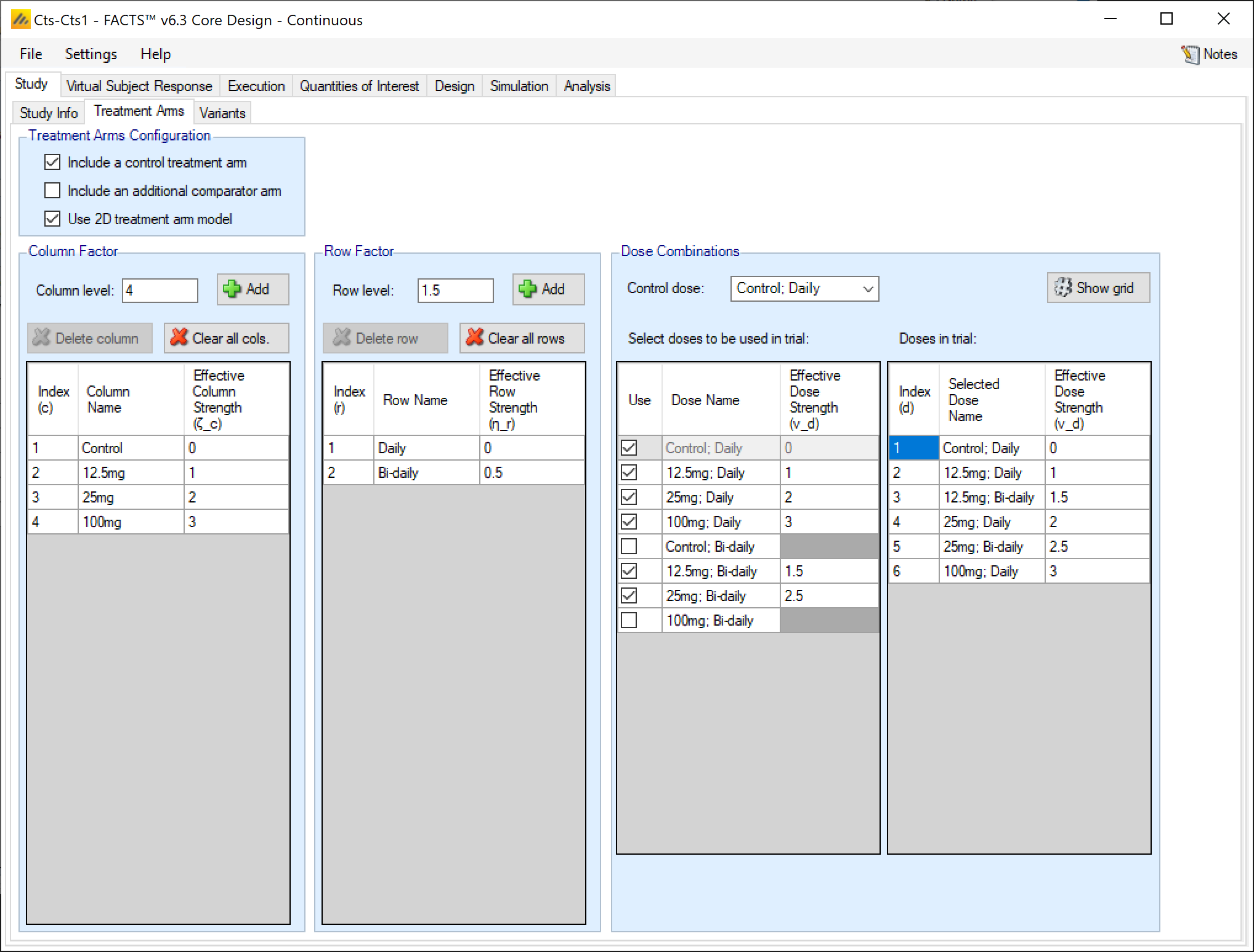If a control treatment arm is included in the trial then a “Control” factor is included in the Column factors and the user selects which combination of this factor and a Row factor is the Control combination. This combination is given the effective strength 0 and moved to the head of the list of doses. If the “include a control treatment arm” option is checked, there must be a combination that acts as control dose. If the option is not checked there will be no control dose.