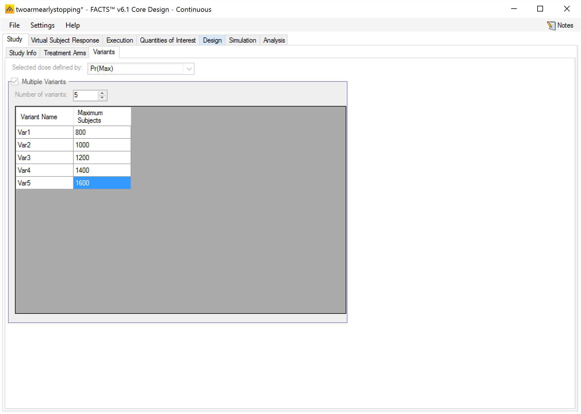 The user enters the number of variants they wish to create. Then in the resulting table, enter different “Maximum Subjects” for each variant. On the simulations tab FACTS will then create a copy of all the scenarios to run with each variant.