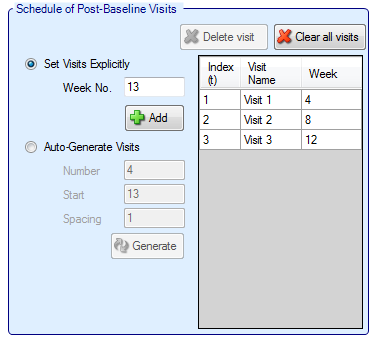 If “Use longitudinal modeling” is checked, the follow-up period for subjects is slightly more involved. Visits are specified one at a time, by entering the required week value for the visit and then clicking ‘Add’, or by specifying a regularly spaced sequence: select ‘Auto-Generate’, enter the number of visits, the week of the first visit and the number of weeks between each visit and then click ‘Generate’.