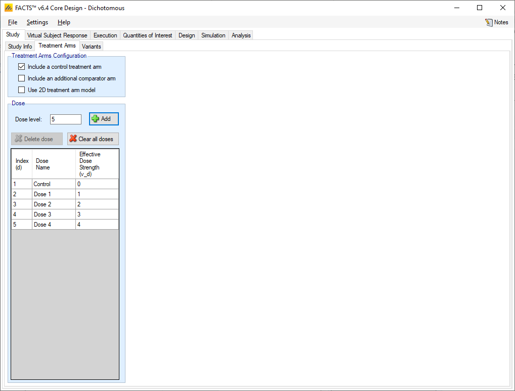 As with all FACTS Core engines, the Treatment Arms sub-tab provides an interface for specifying the various dose levels, Control and Additional Comparator arms, and whether using a 2D treatment arm model.