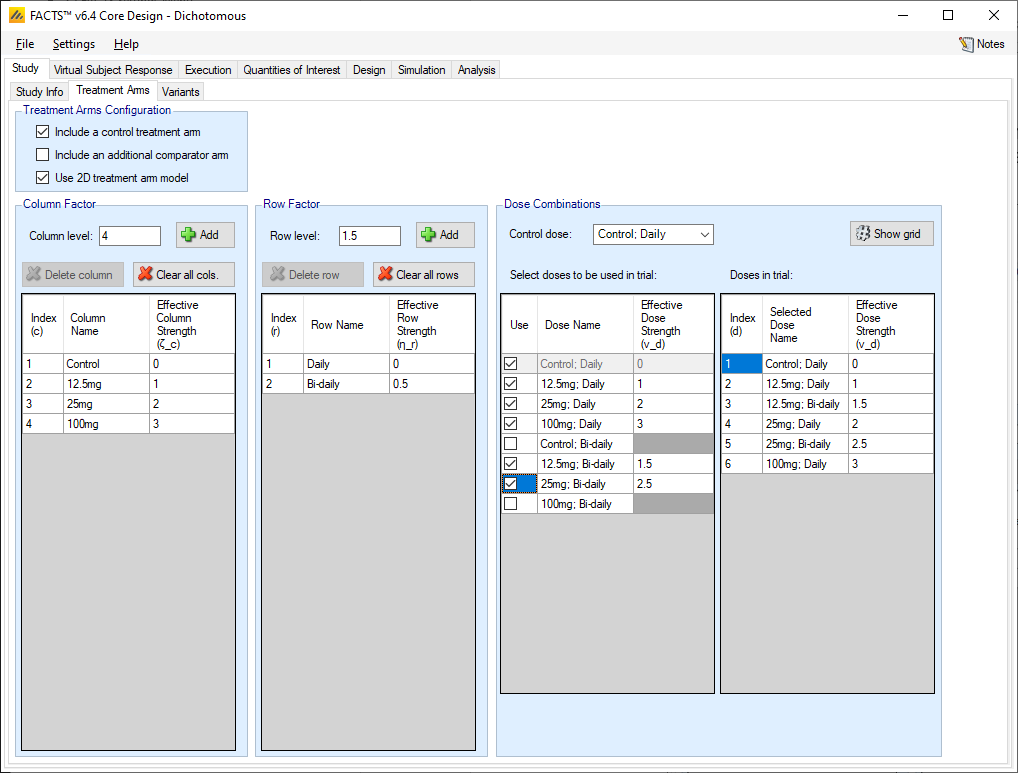 If the user checks the “Use 2D treatment arm model” option, the screen changes to allow the treatment strengths to be specified on 2 axes, and to specify which of the treatment combinations thus created will actually included as arms in the trial.